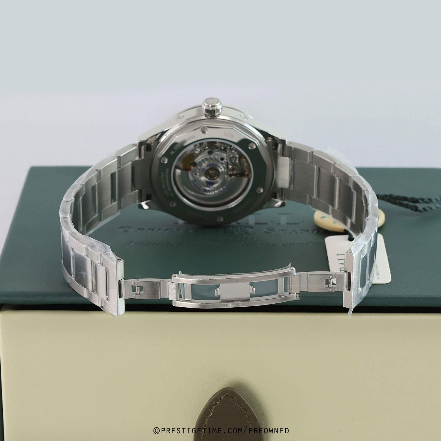 Case: Brushed & polished stainless steel case. Green dial. Polished hands. Applied index hour markers. Fine printed minutes/seconds & fractions of a seconds track.
