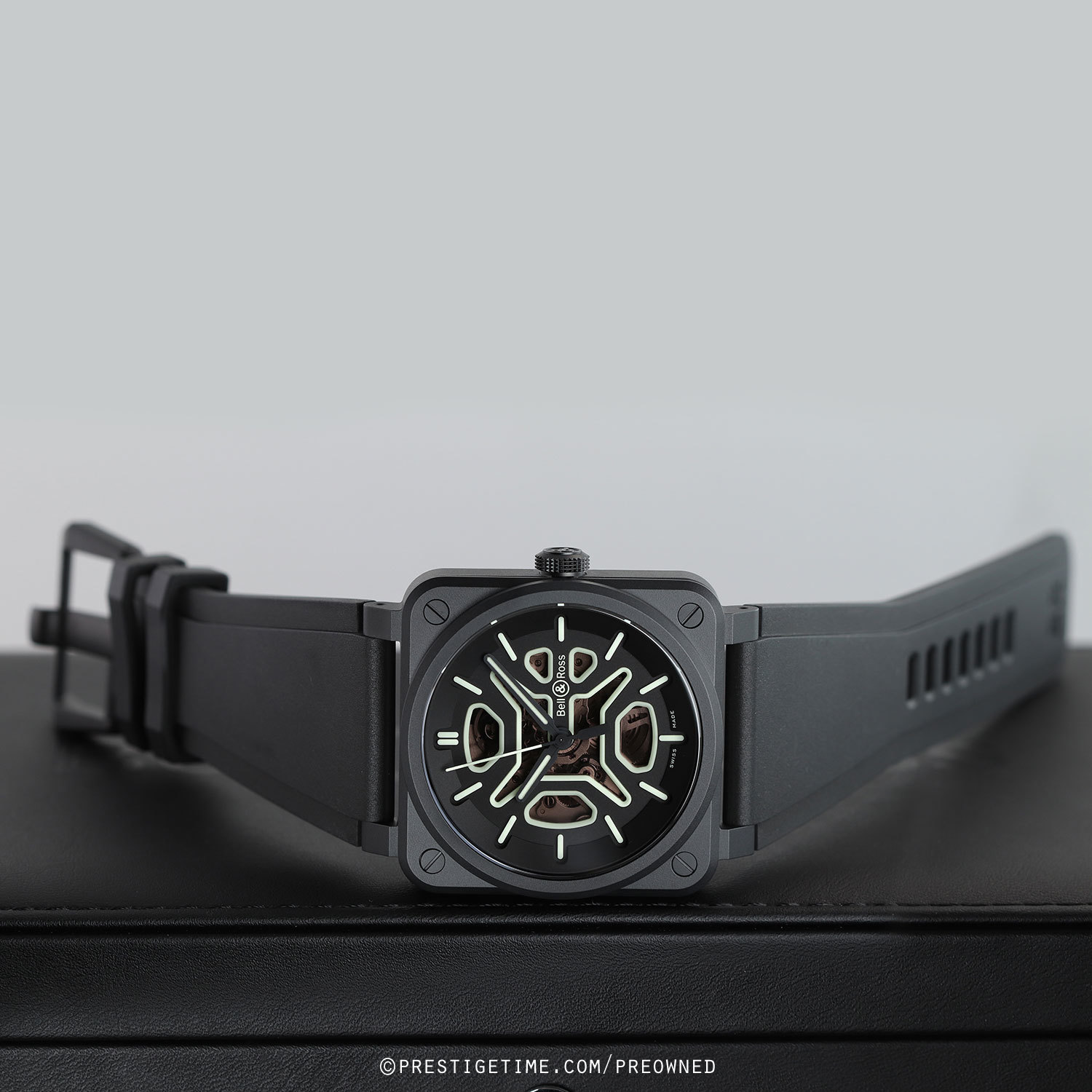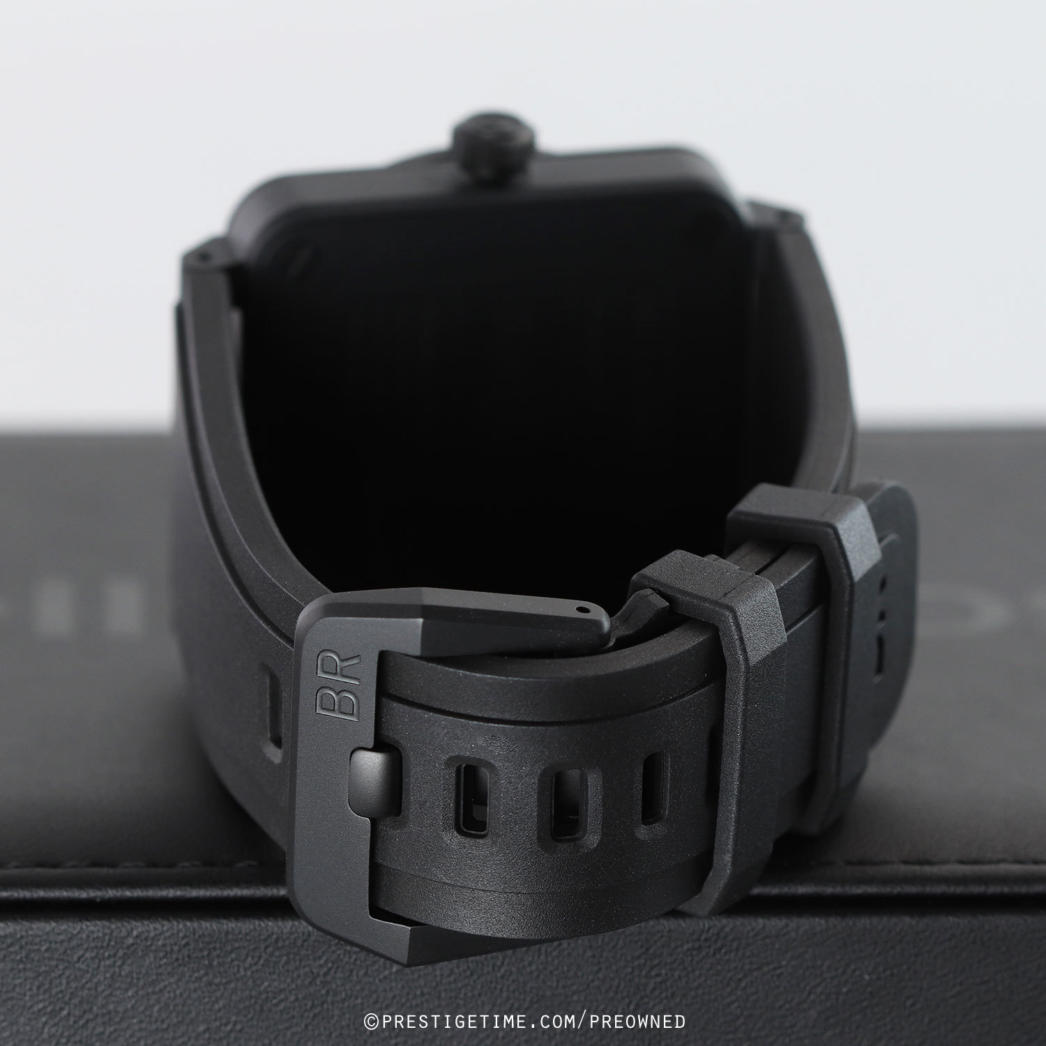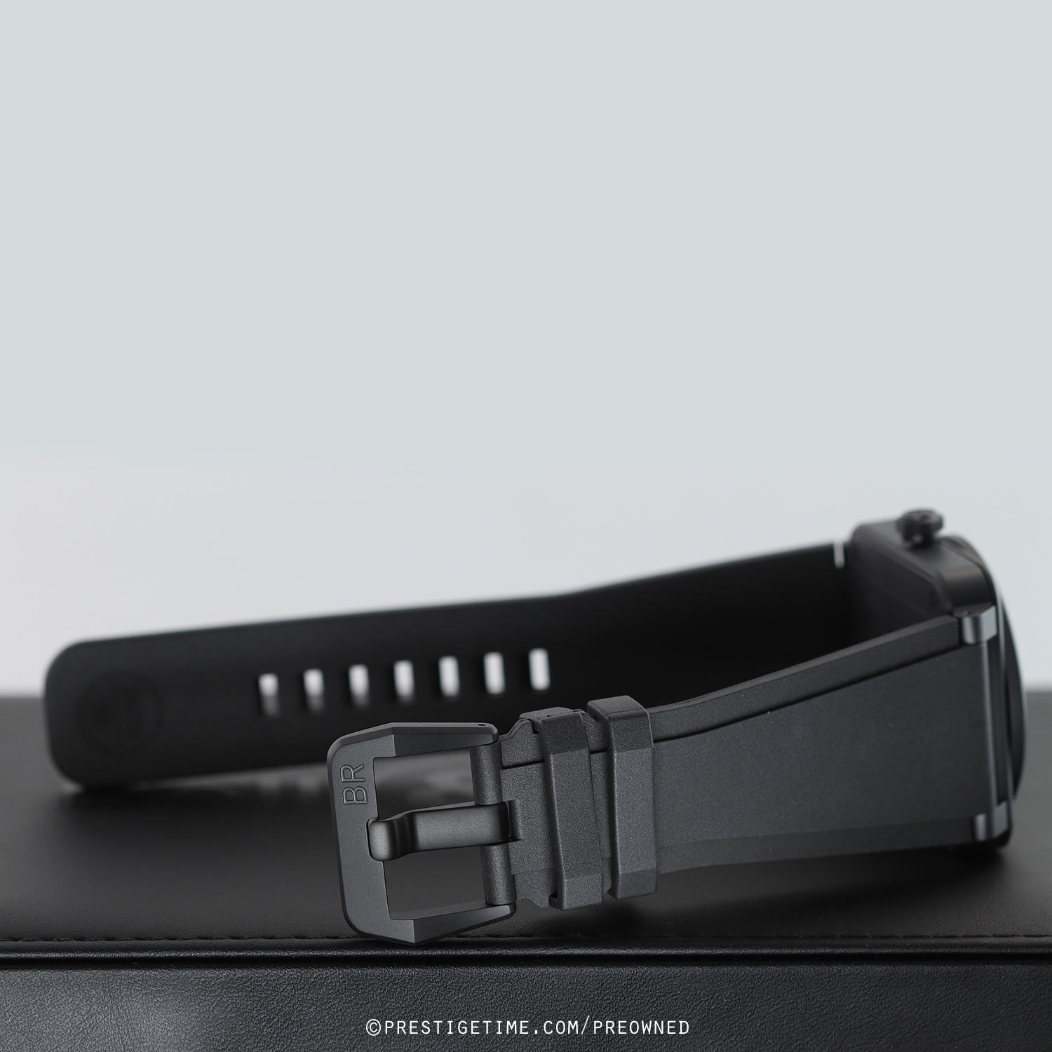 1. Fitted on its original Bell & Ross black rubber strap with a stainless steel tang buckle. This strap is unworn in new condition with its full wear lifespan remaining.