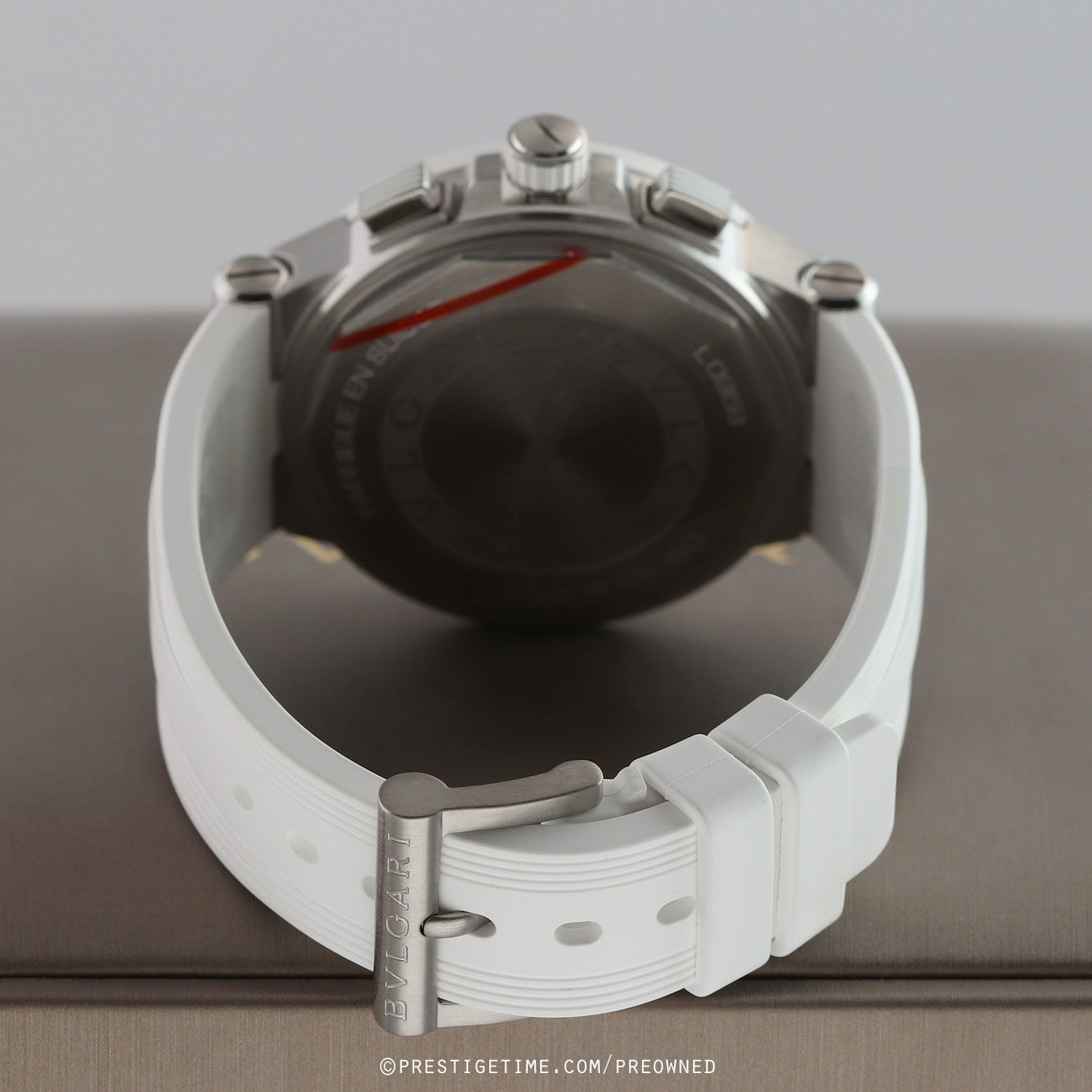 Strap: Fitted on its original Bulgari white rubber strap with a stainless steel tang buckle. The strap is unworn in brand new condition, with its full wear lifespan remaining.