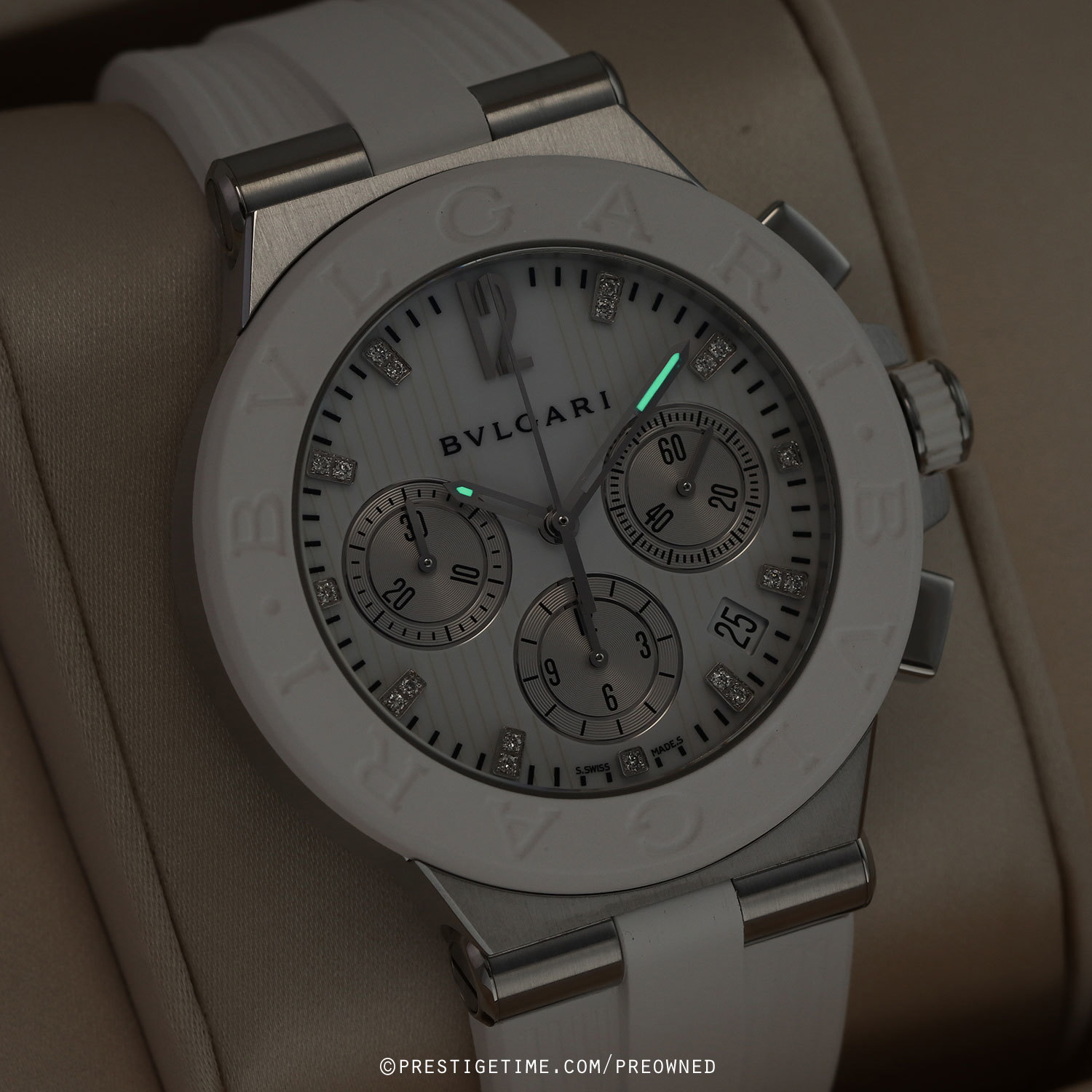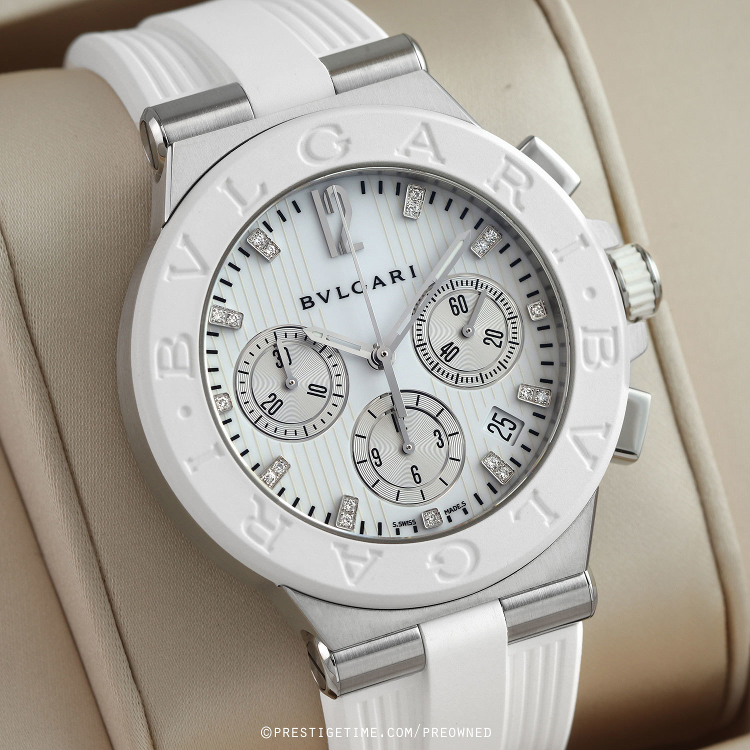 Case: Brushed stainless steel case. Polished stainless steel crown & buttons with white rubber grip & tips. White rubber coated steel bezel embossed with the iconic BVLGARI•BVLGARI logo. White mother of pearl dial with a vertical linear engraved pattern. Silver sub-dials. Applied diamond hour markers, excluding the applied polished 12 o'clock marker. Polished hands, the hour & minute hands partially skeletonized with luminous tips. Fine printed minute/seconds track on the dial perimeter. Small seconds sub-dial at 3 o'clock. Date window between 4 & 5 o'clock.