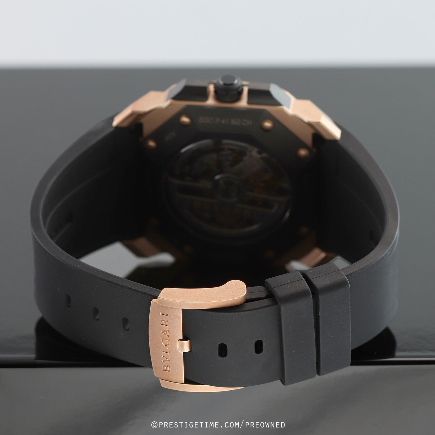 Strap: Fitted on its original Bulgari black rubber strap with a solid 18kt rose gold tang buckle. The strap is unworn & in perfect new condition.