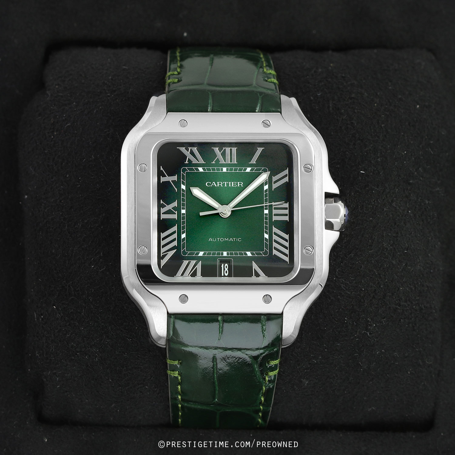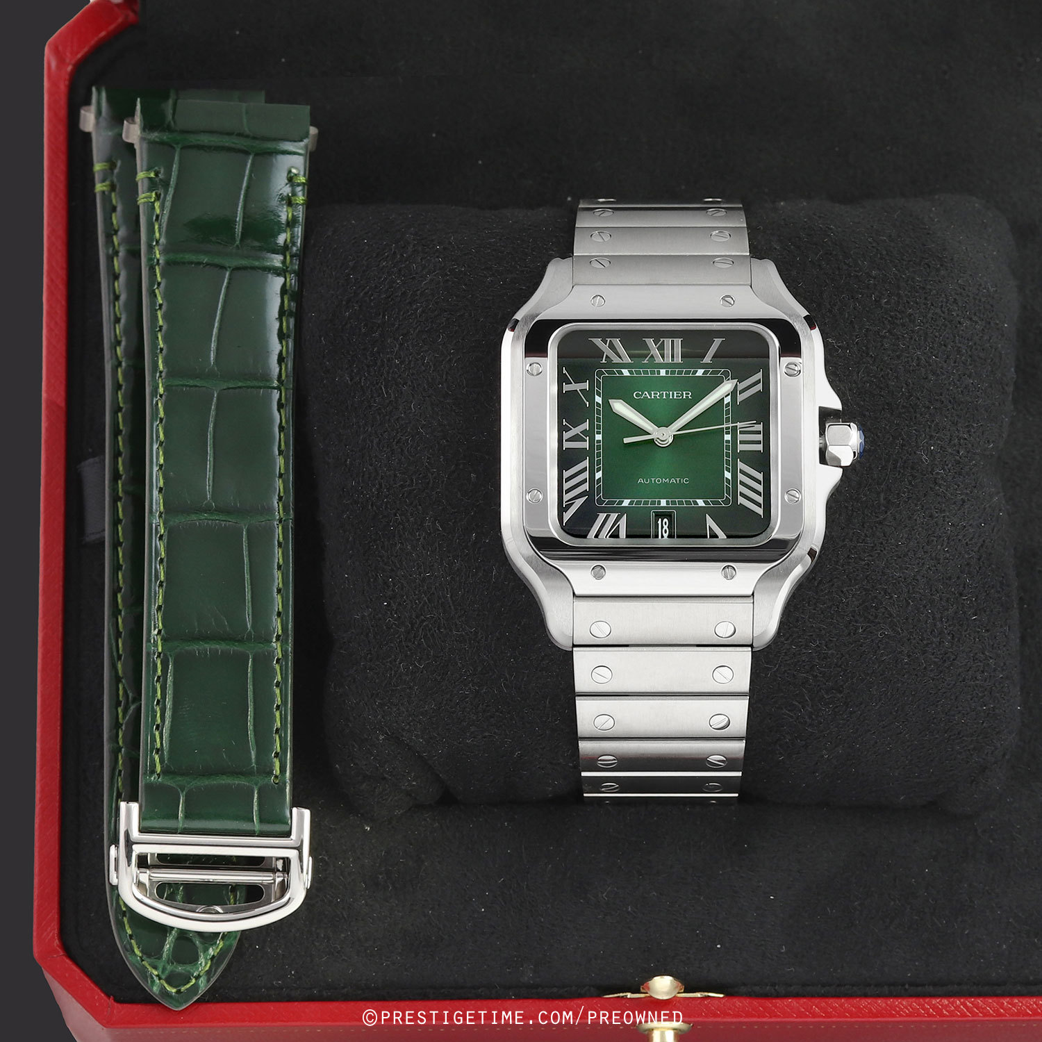 - Delivered with an addition Cartier original green alligator leather strap featuring an interchangeable stainless push-button deployant buckle. The strap is in brand new, unworn condition.