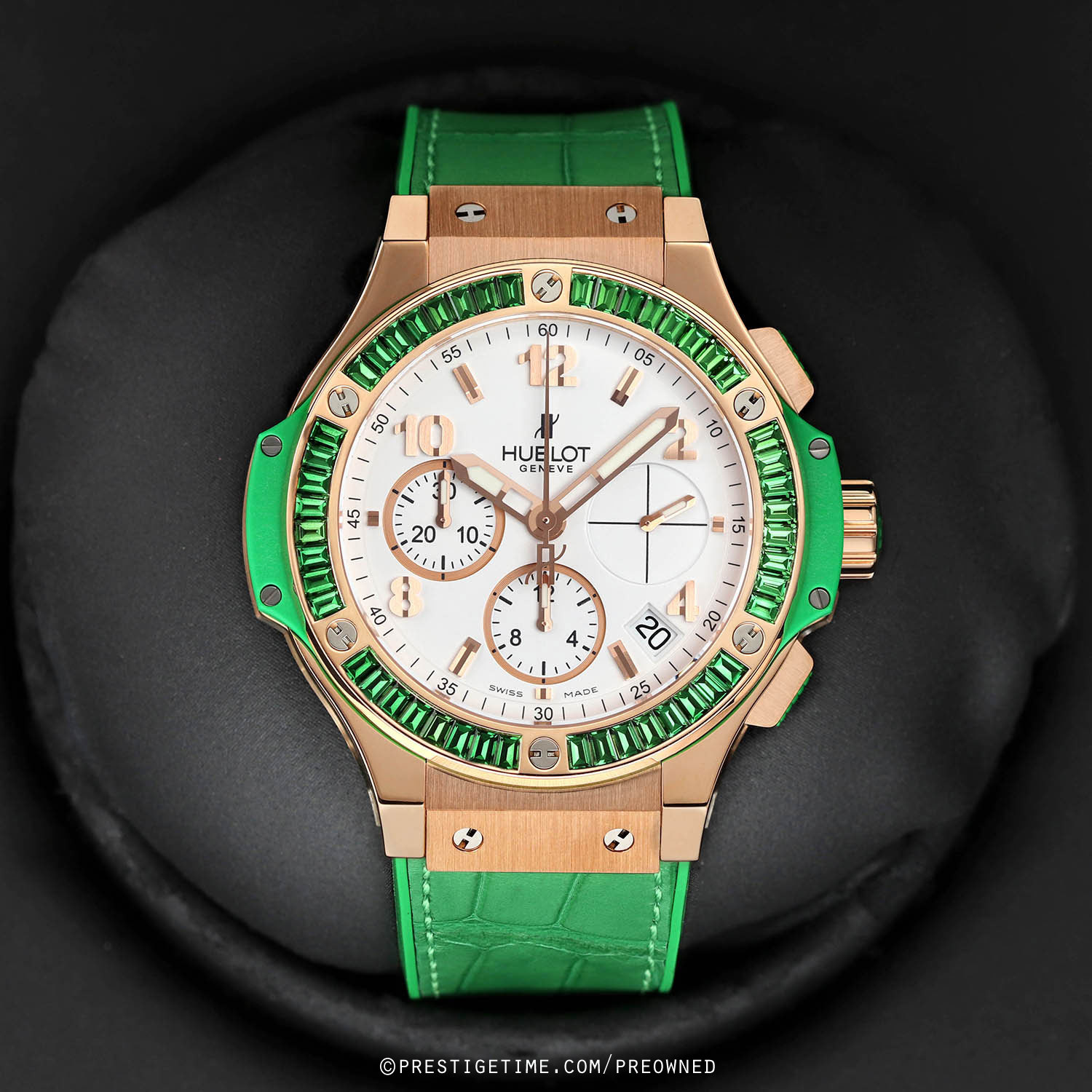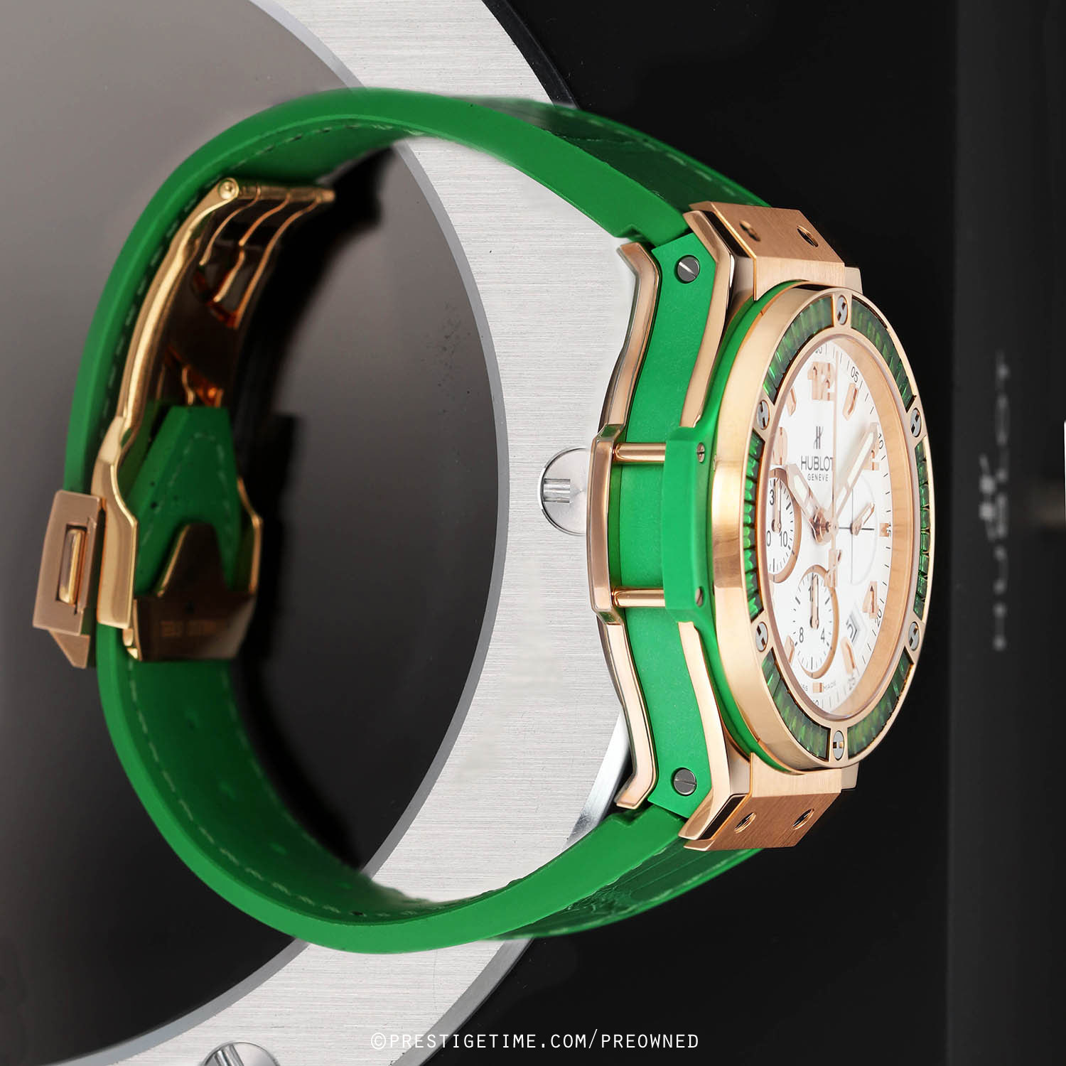 Strap: Fitted on its original Hublot Green gummy-alligator strap (alligator leather top & rubber lining) with a solid 18kt rose gold push-button deployant clasp. The strap is new & unworn with its full wear lifespan remaining.