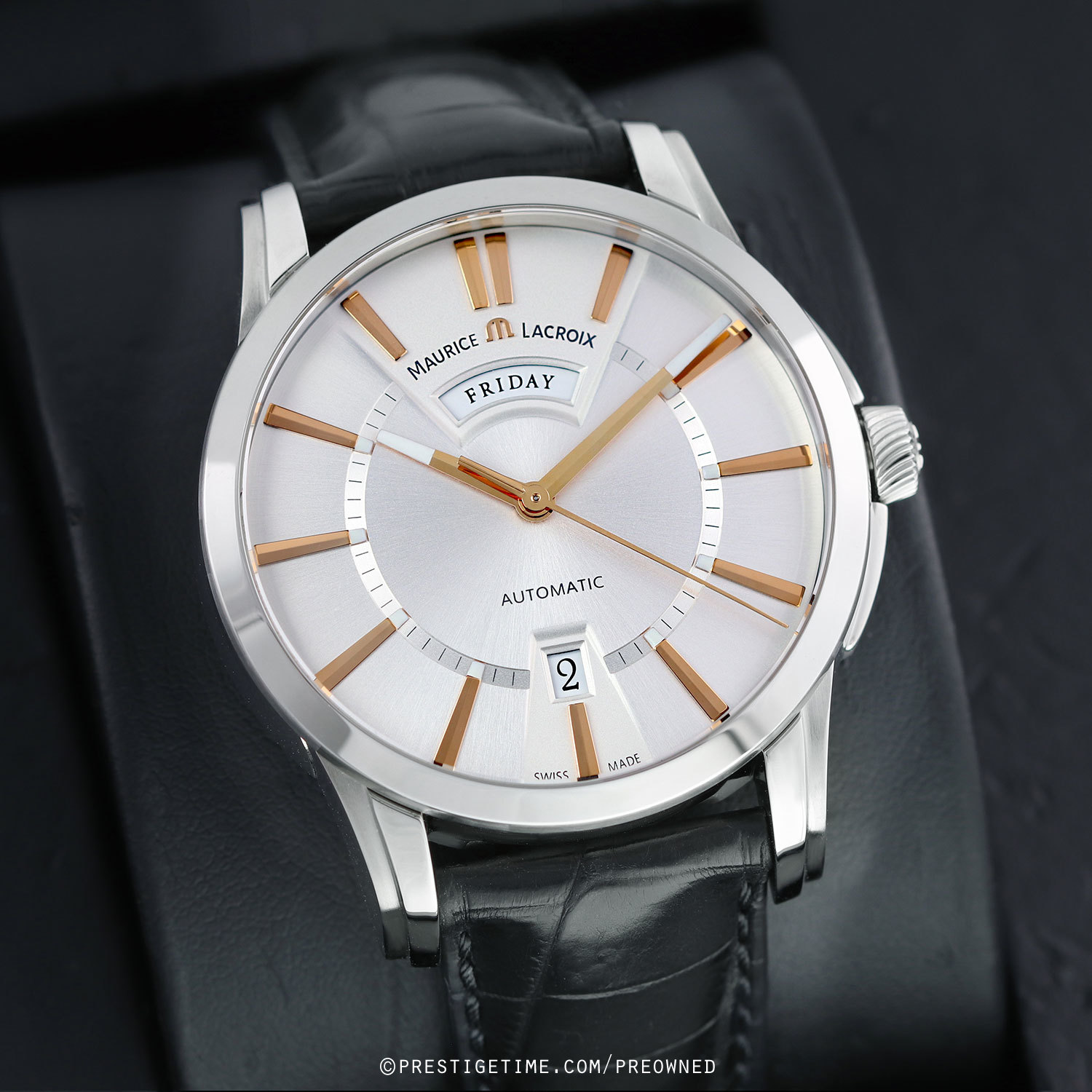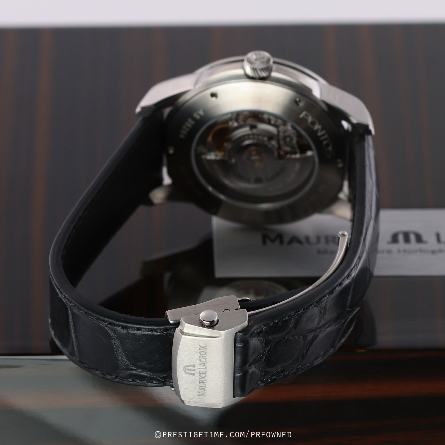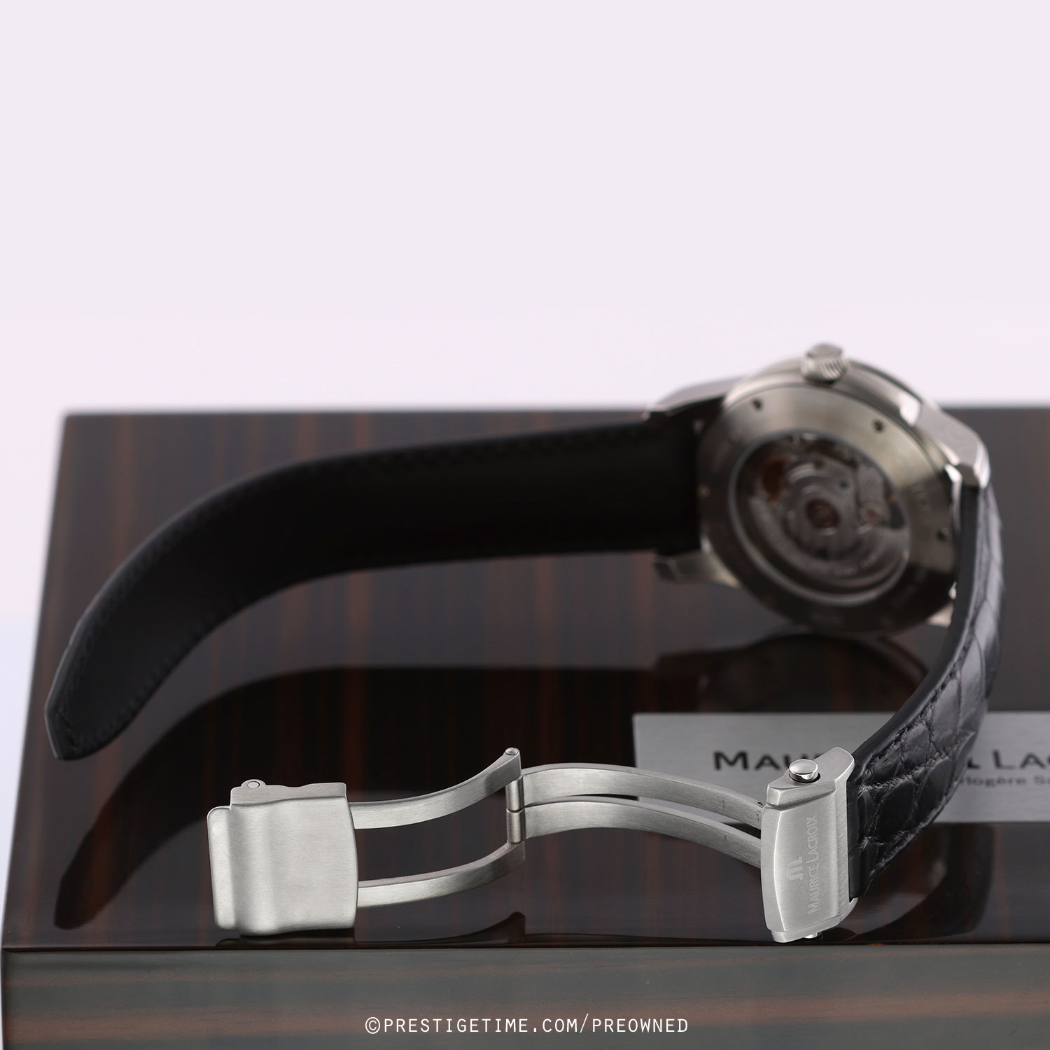 Strap: Fitted with its original Maurice Lacroix black calfskin strap with alligator print & a stainless steel deployant buckle. The strap is unworn and still crisp with full life remaining.