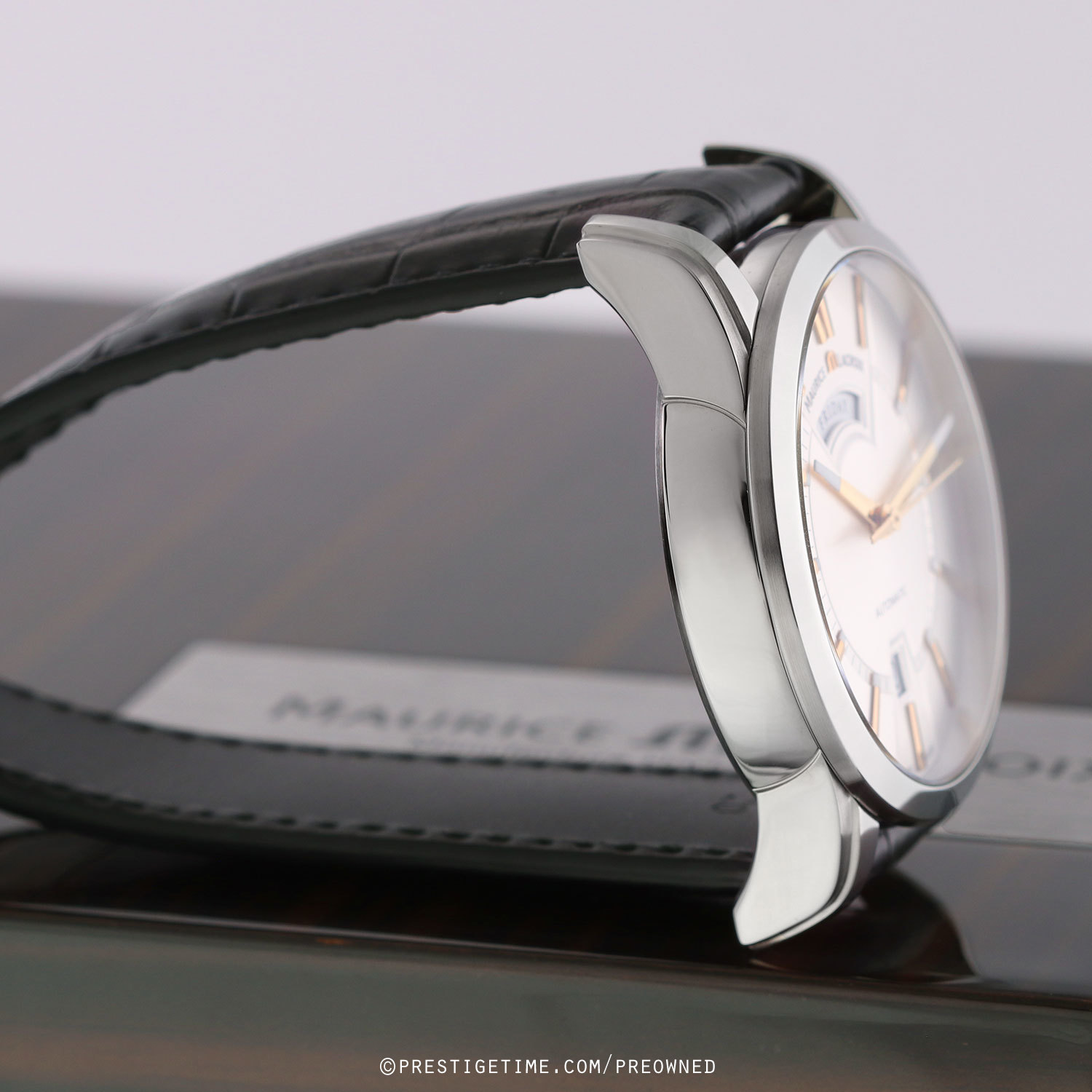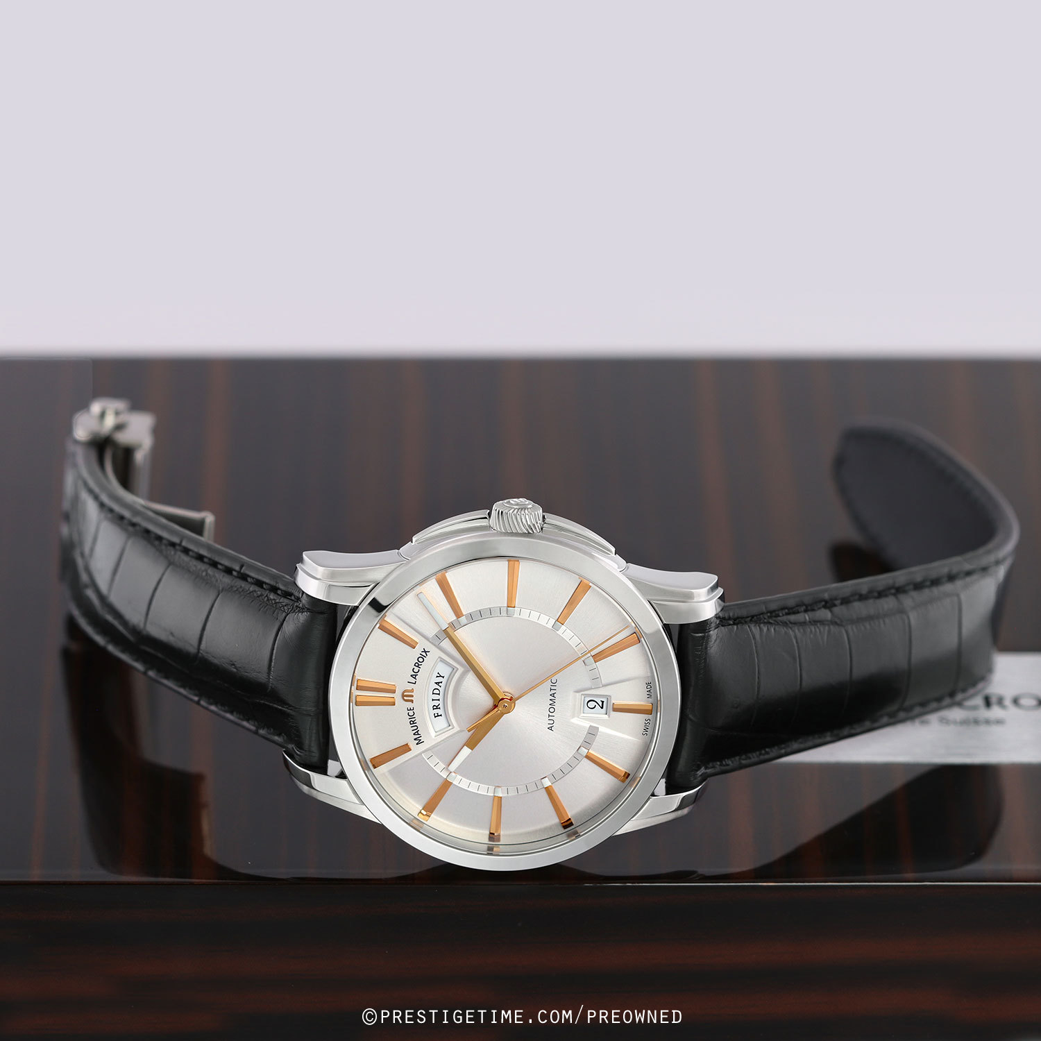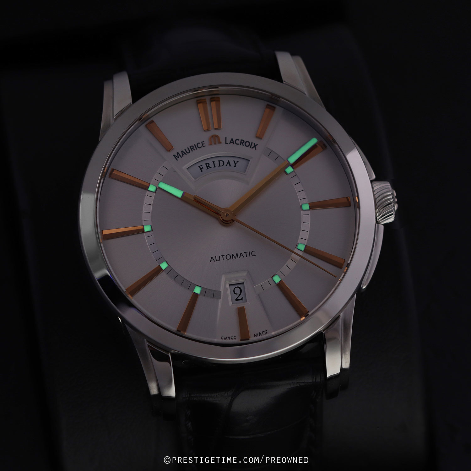 Strap: Fitted with its original Maurice Lacroix black calfskin strap with alligator print & a stainless steel deployant buckle. The strap is unworn and still crisp with full life remaining.