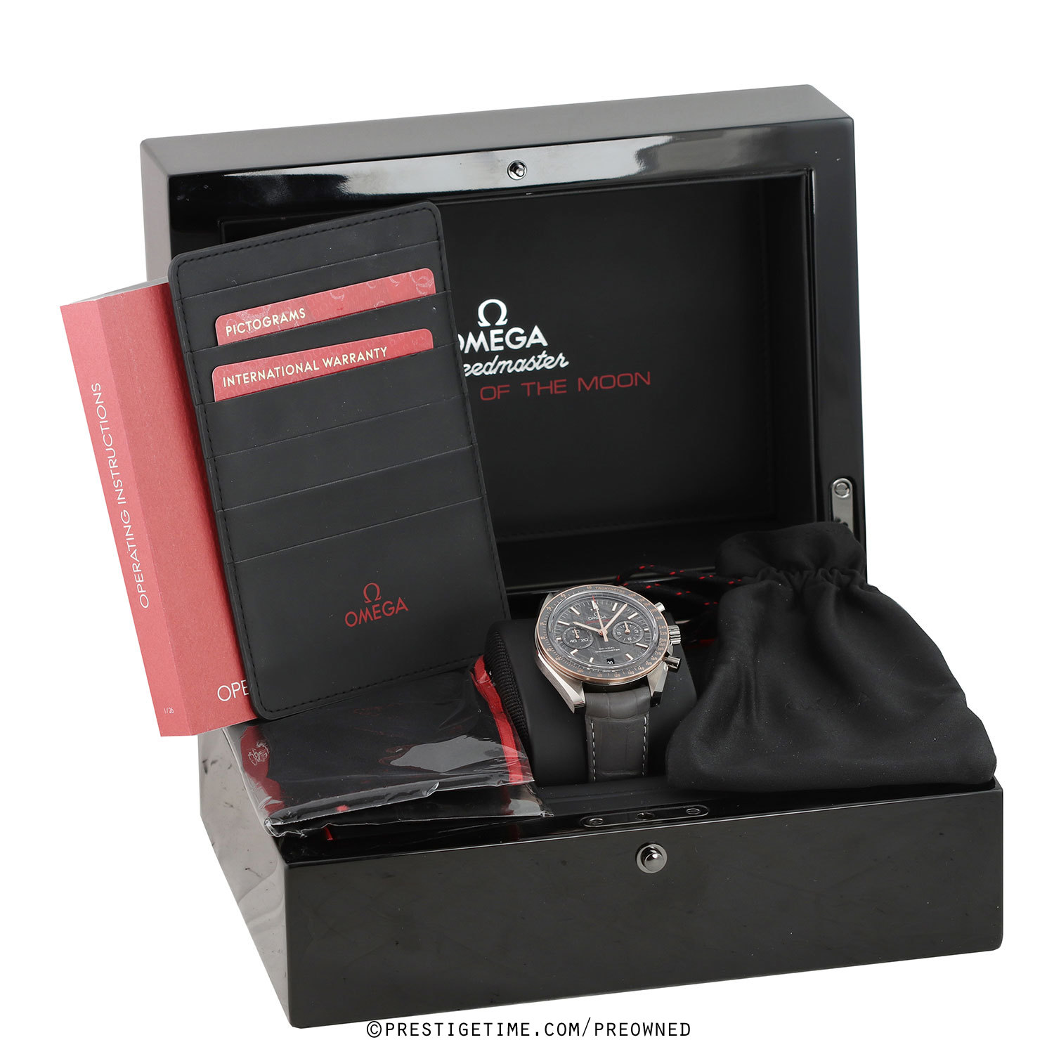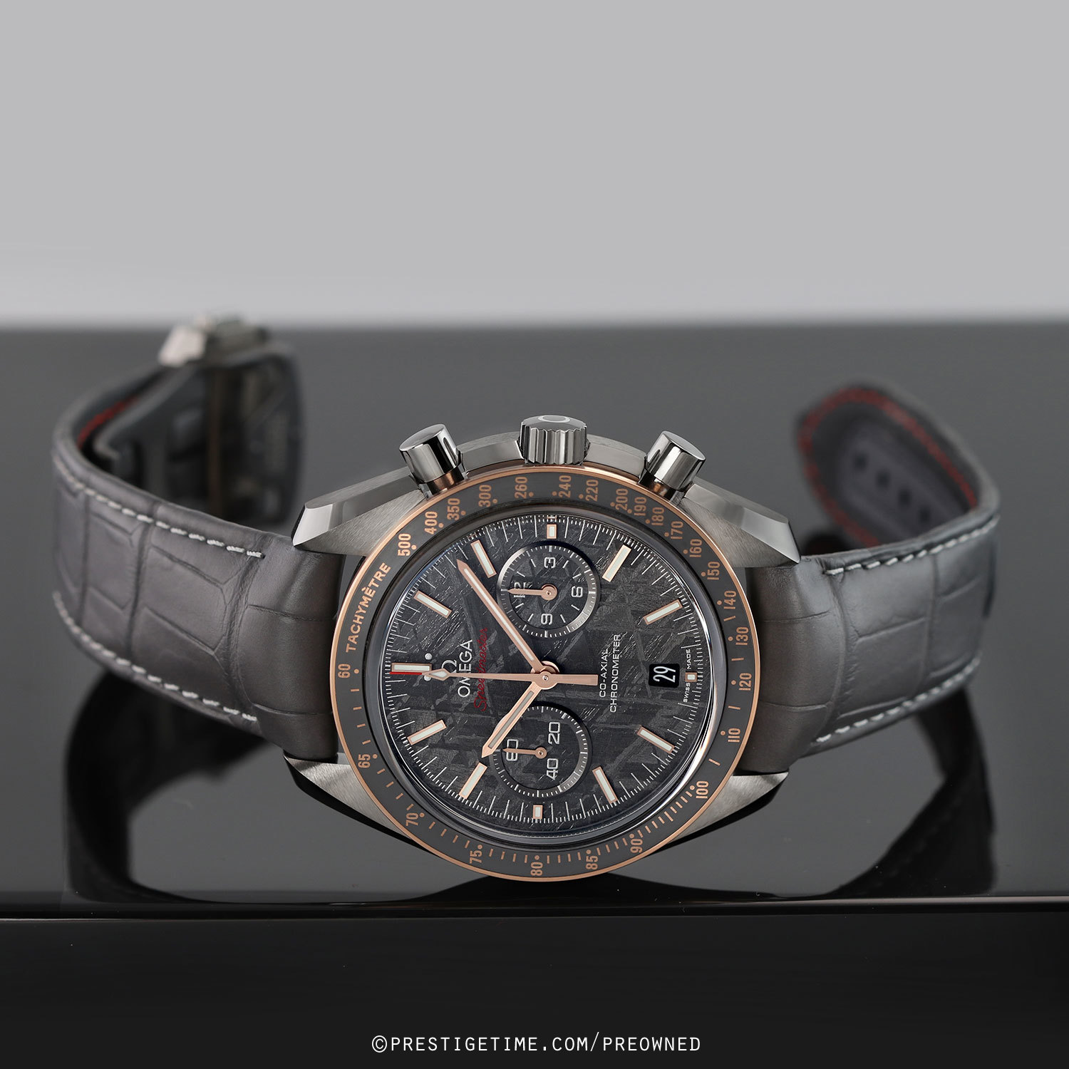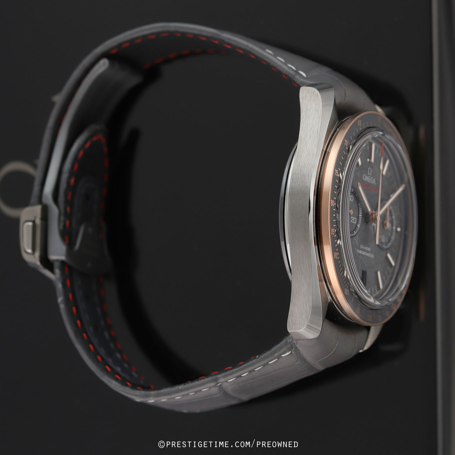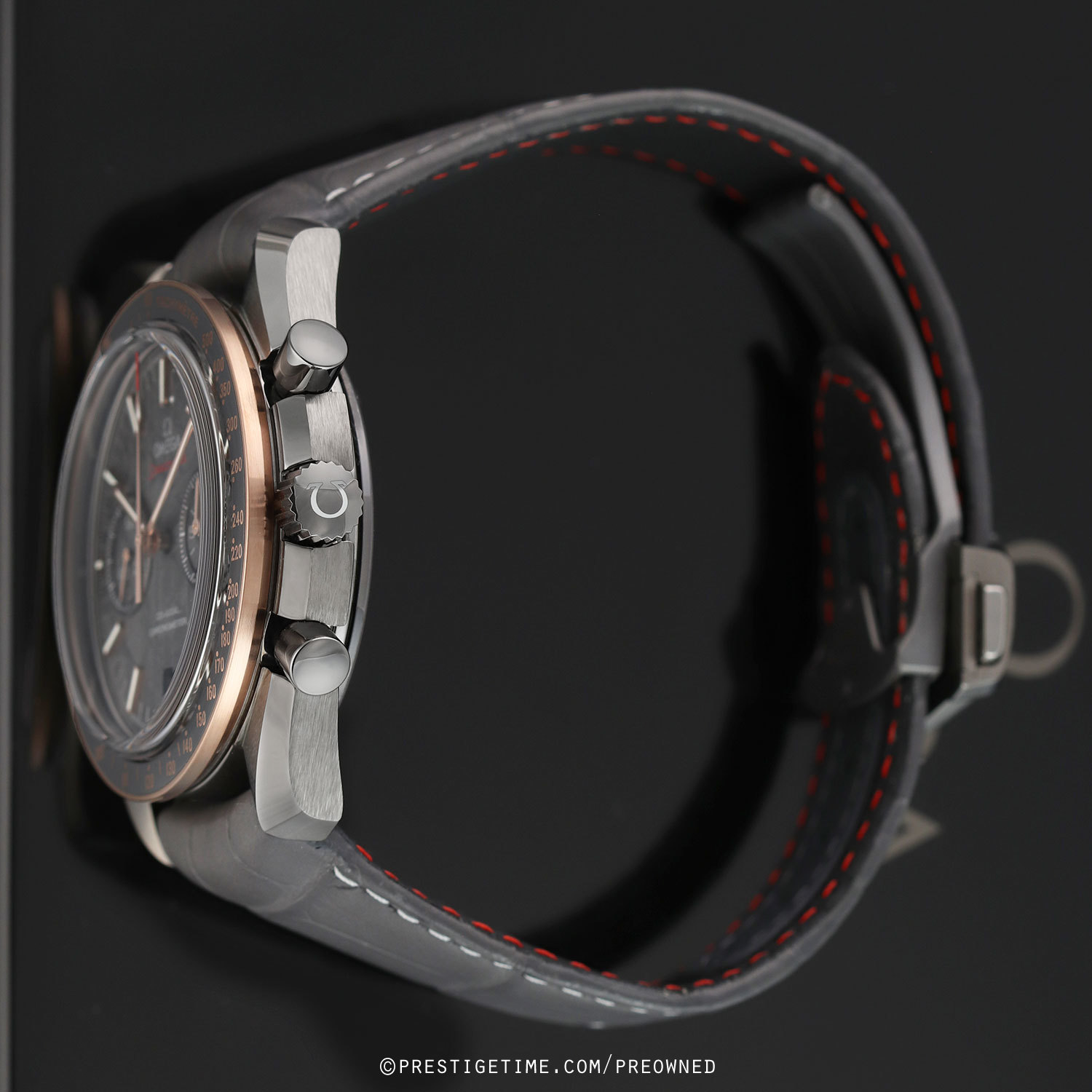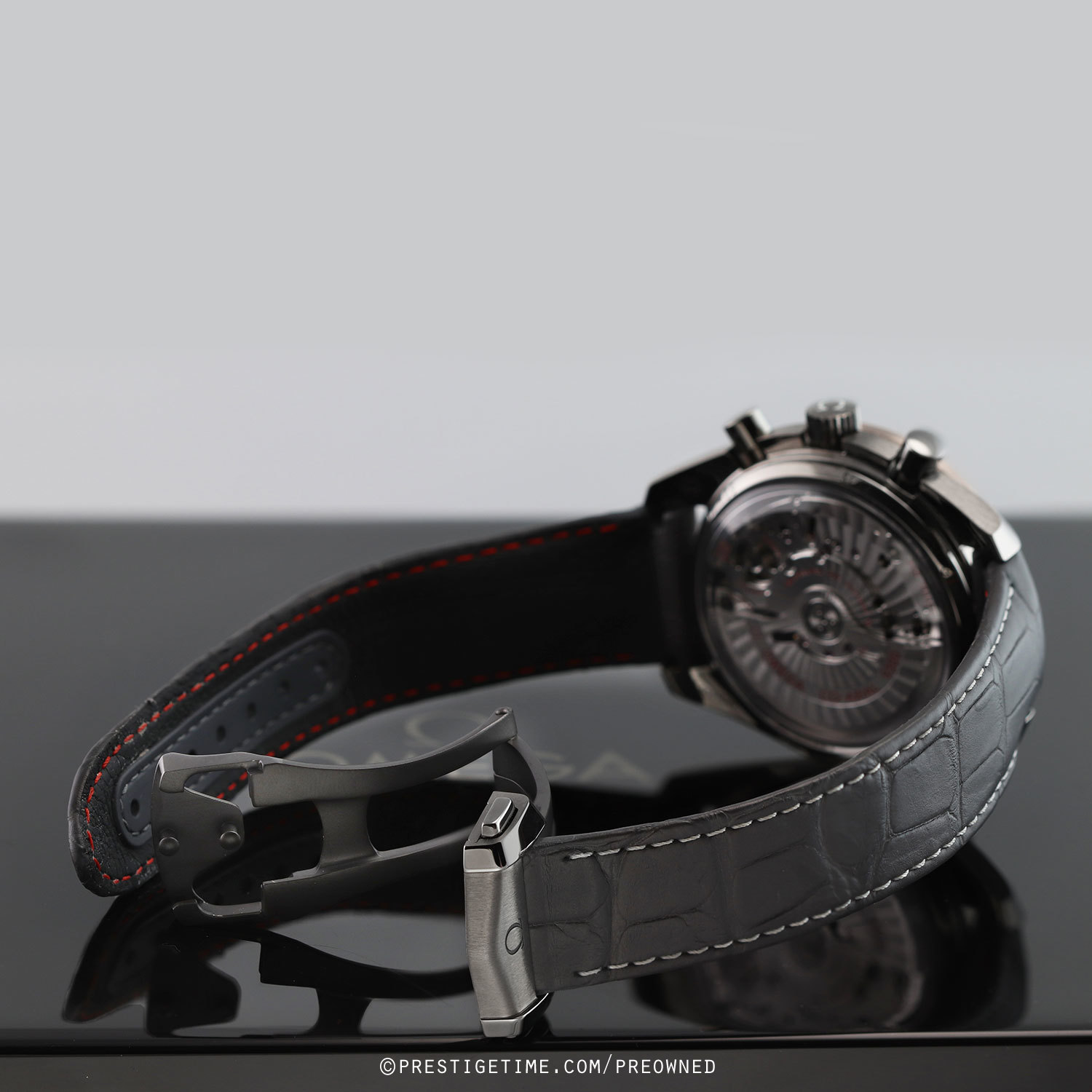 Strap: Fitted on its original Omega grey alligator leather strap with contrasting light grey stitching, and a grey ceramic & PVD coated push-button deployant buckle. The strap is in excellent condition with the majority of its wear life-span remaining. We would grade the strap as in 98% condition.