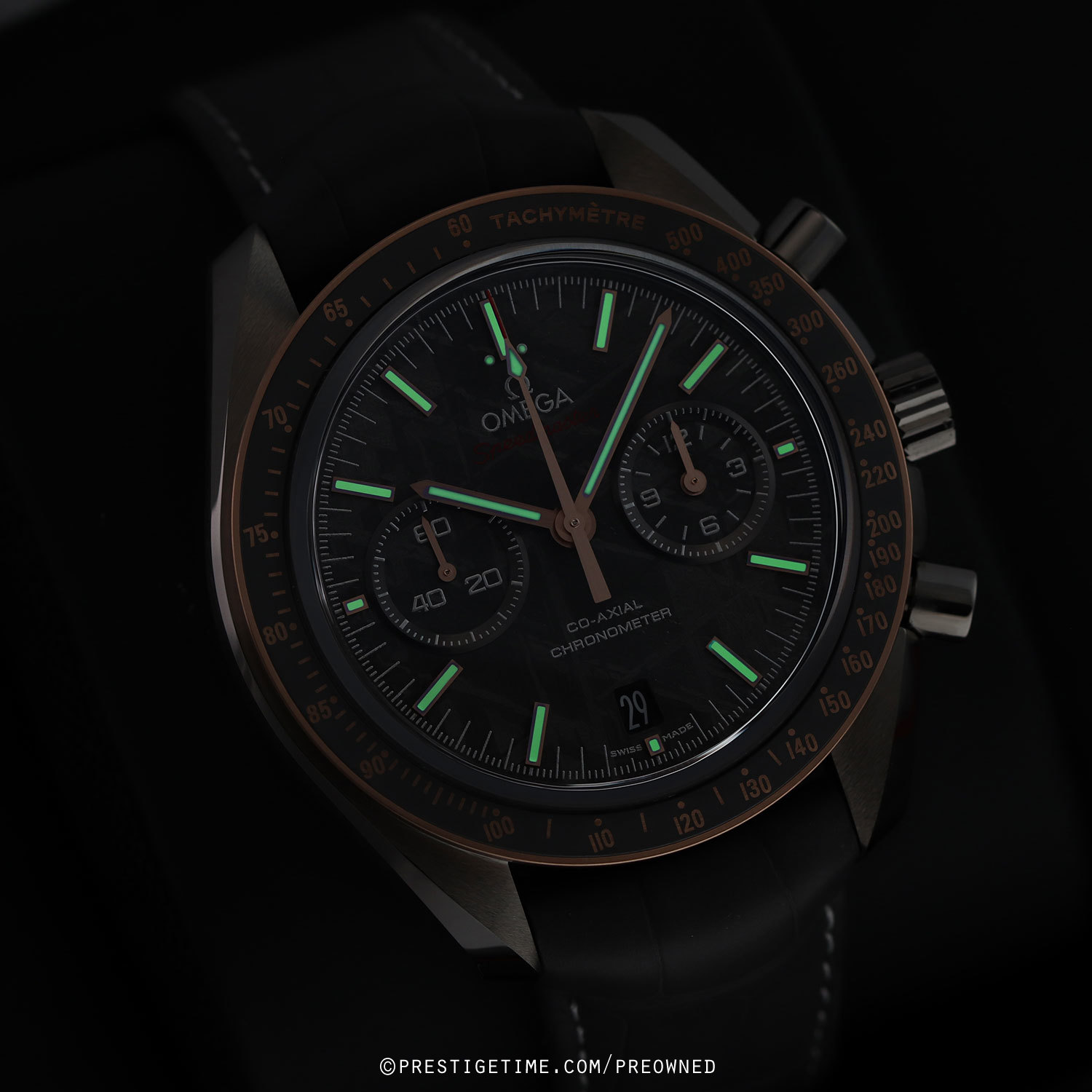 Case: Brushed & polished grey ceramic case. Polished grey ceramic crown & chrono buttons. Fixed 18kt Sedna (rose) gold bezel with a grey silicon nitride ceramic bezel ring & Ceragold Tachymetre scale. Grey meteorite dial. Brushed Sedna gold hands, the central hands with luminous fill. Applied brushed Sedna gold index hour markers with luminous fill. Fine printed minute/seconds & fractions of a second track via laser ablation. Small seconds sub-dial at 9 o'clock. Date window at 6 o'clock. Domed sapphire crystals on front & back.