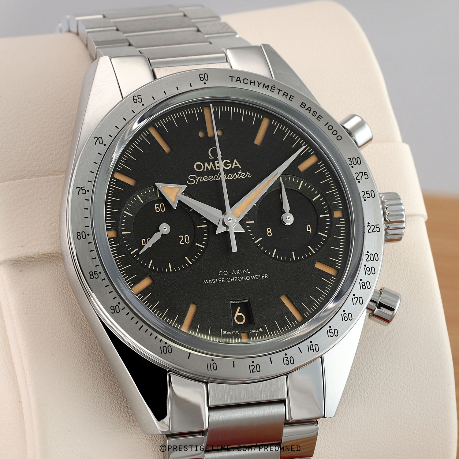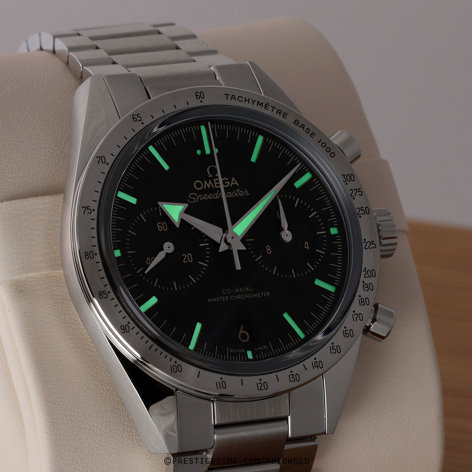 Case: Brushed & polished finished stainless steel case. Fixed position stainless steel bezel with a tachymeter scale. Domed sapphire crystal. Black dial with a very fine textured finish, stepped-down sub-dials. Sandwich construction dial with cut-out index hour marker and with vintage colored luminous backing. Polished hands. Broad-Arrow hour & minute hands with vintage colored luminous fill. Fine printed minutes/seconds & fractions of a second track. Small seconds sub-dial at 9 o'clock. Date window at 6 o'clock.