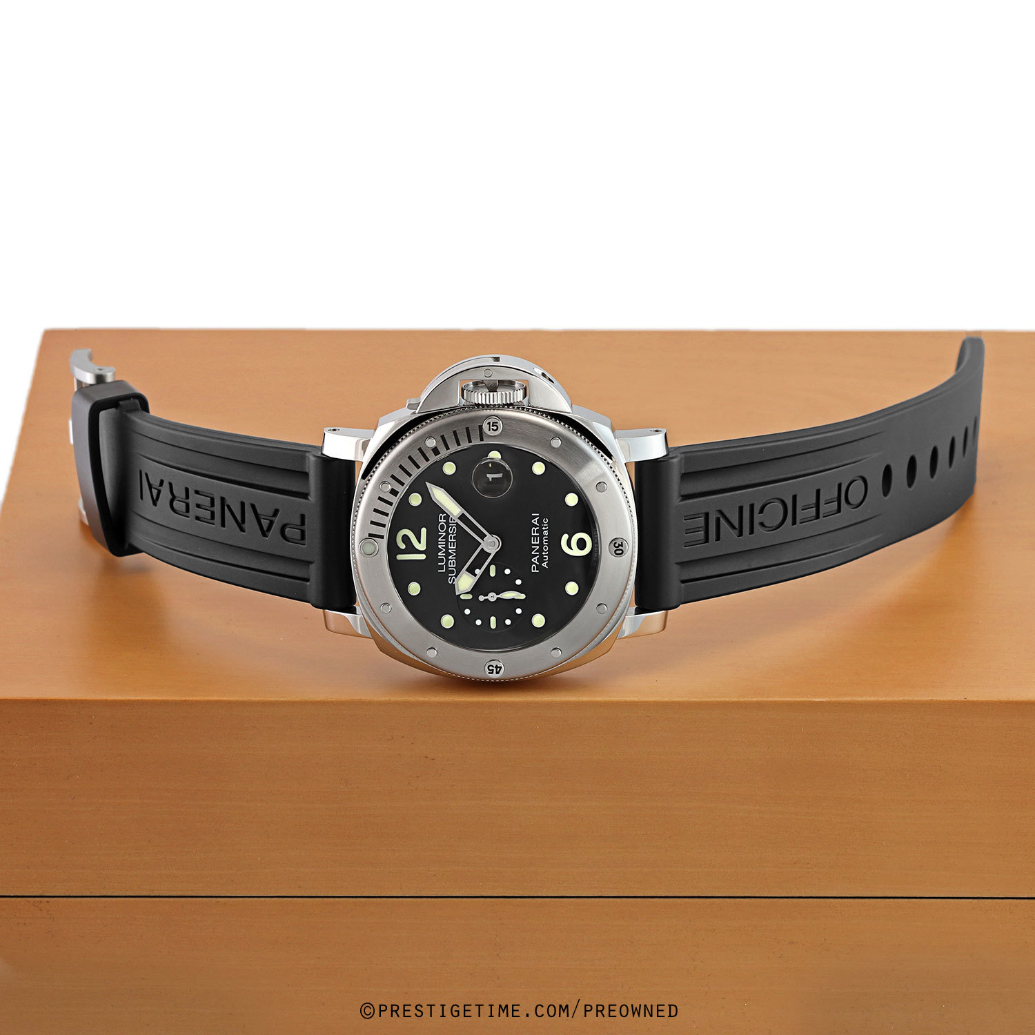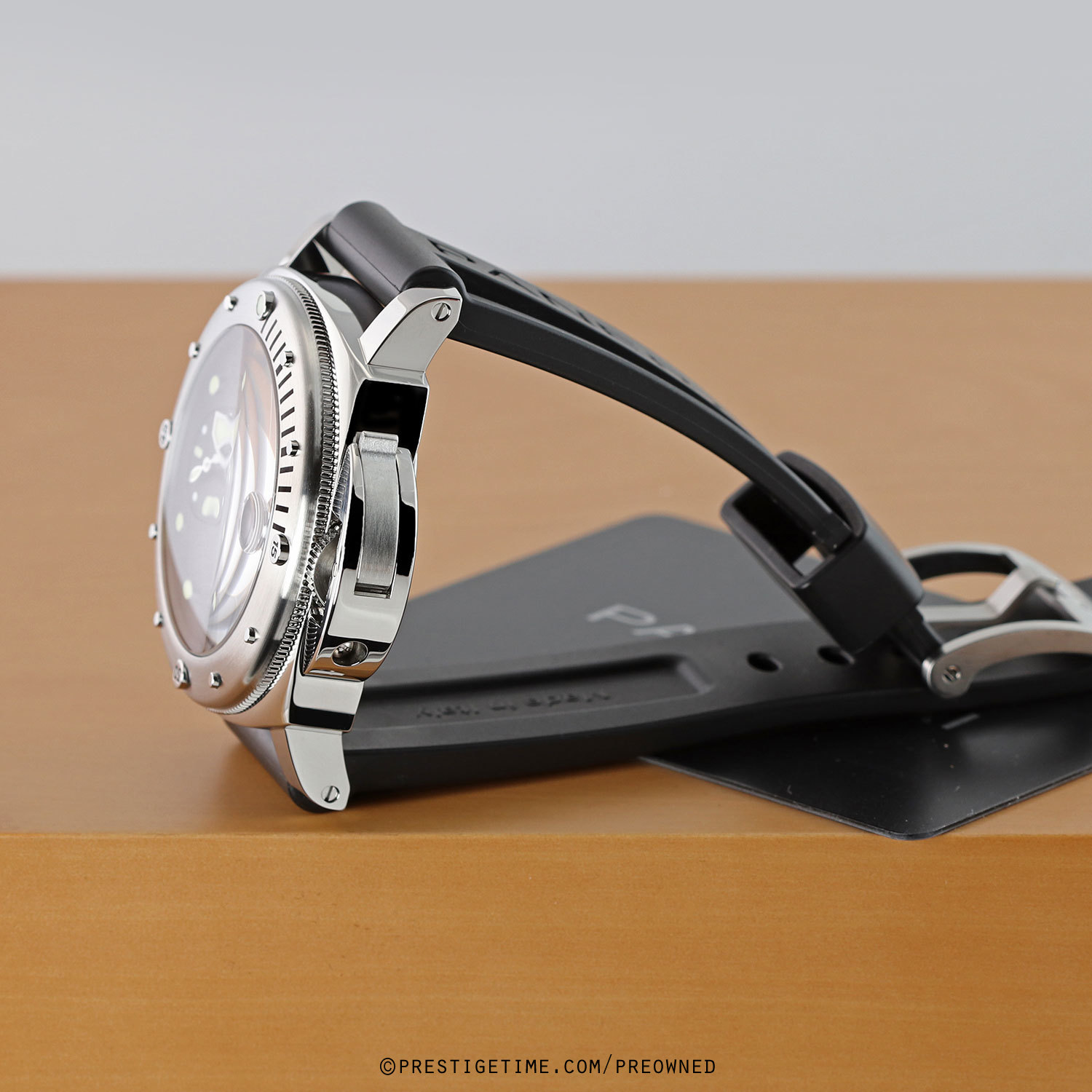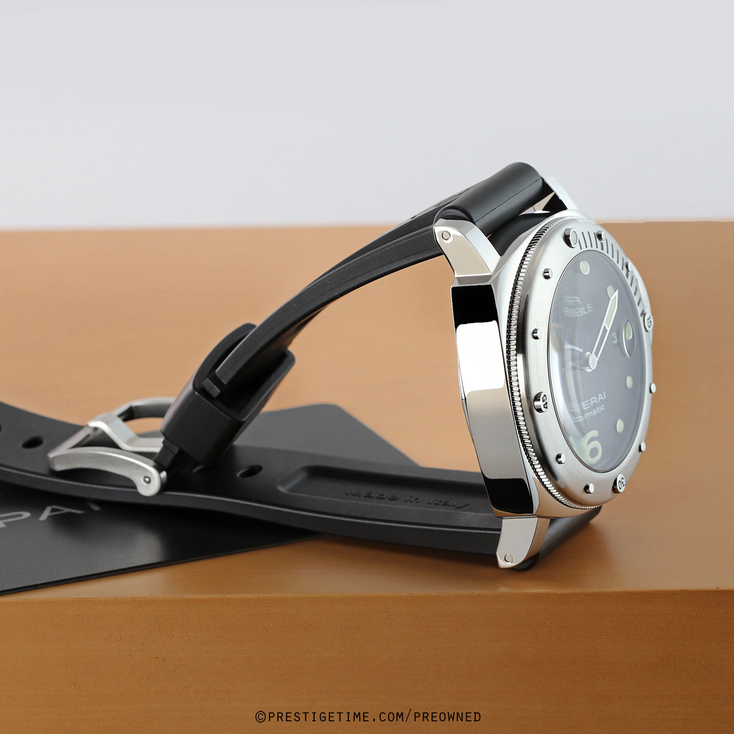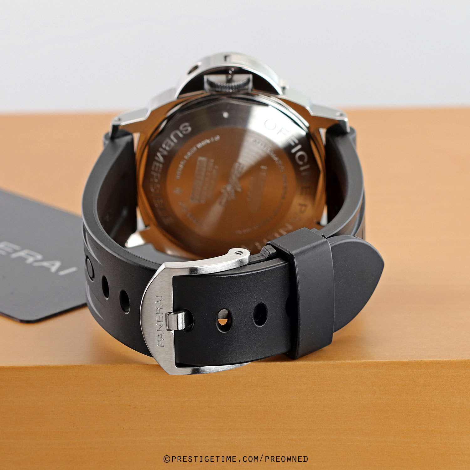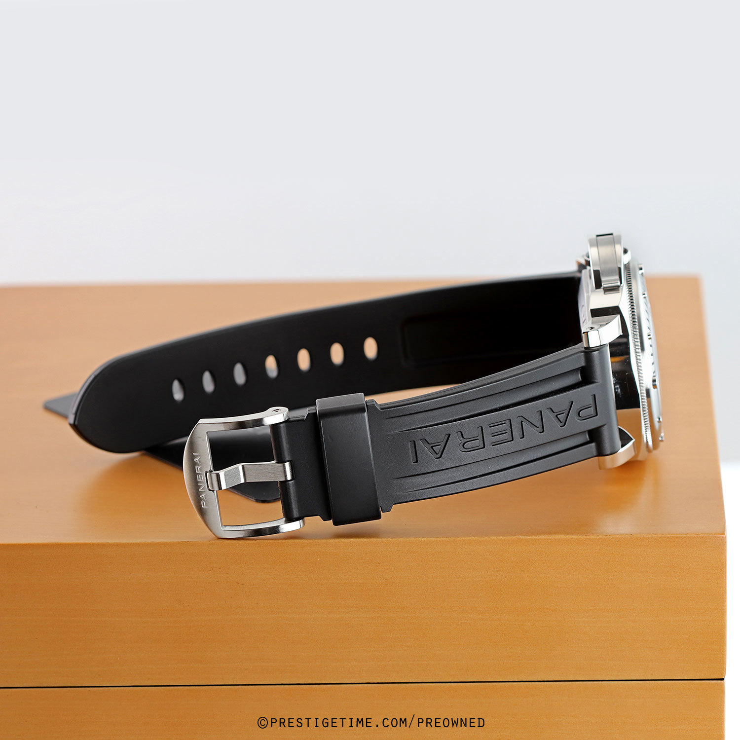 - Fitted on its original Panerai black rubber strap with a stainless steel tang buckle. This strap is in excellent condition with plenty wear-lifespan remaining. We would grade the strap in 95% condition.