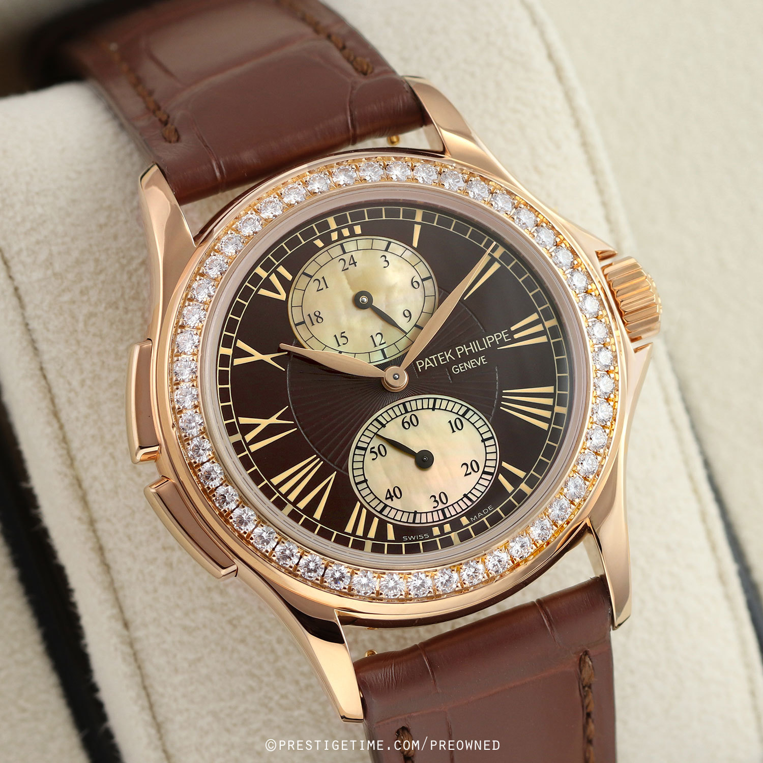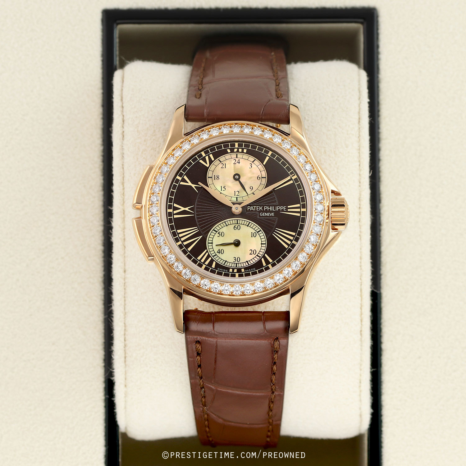 Case: Polished 18kt rose gold case. Bezel factory set with 48 brilliant cut diamonds weighing a total of 1.08 carats. Deep brown main dial with a sun-ray textured center. Off-white mother of pearl sub-dials. Painted gold toned Roman numeral hour markers. Polished rose gold hands center hands, blackened sub-dial hands. Small seconds sub-dial at 6 o'clock.