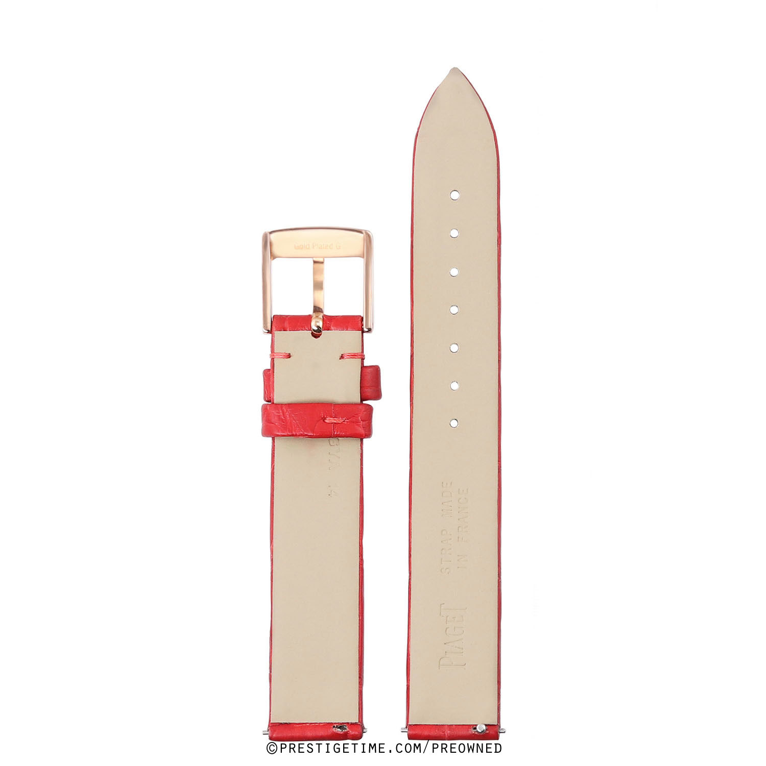 Unworn Piaget red alligator strap with branded gold plated pin buckle. This strap has quick release pins.