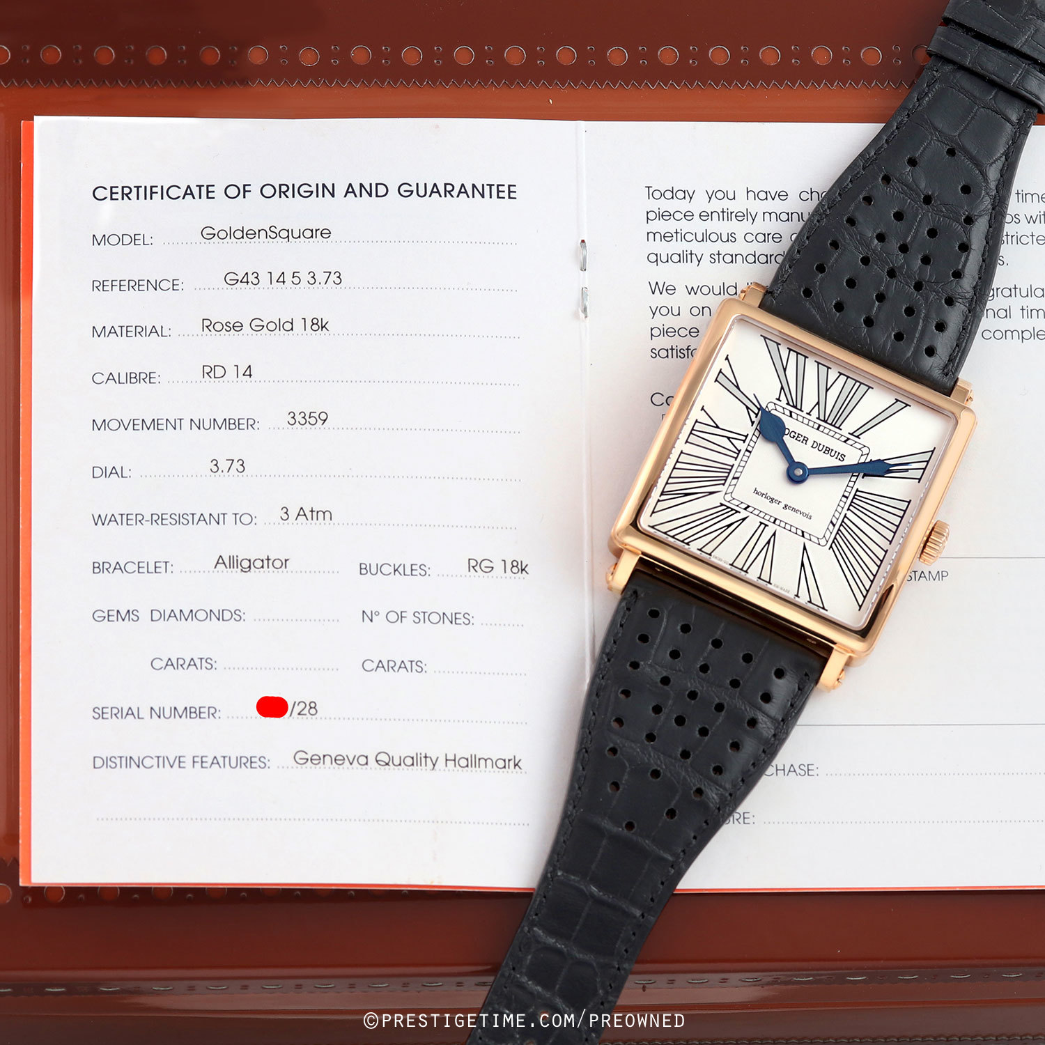 Strap: Fitted on its original Roger Dubuis black alligator perforated leather strap with a solid 18kt rose gold tang buckle. The strap is unworn, in new condition with its full wear lifespan remaining.
