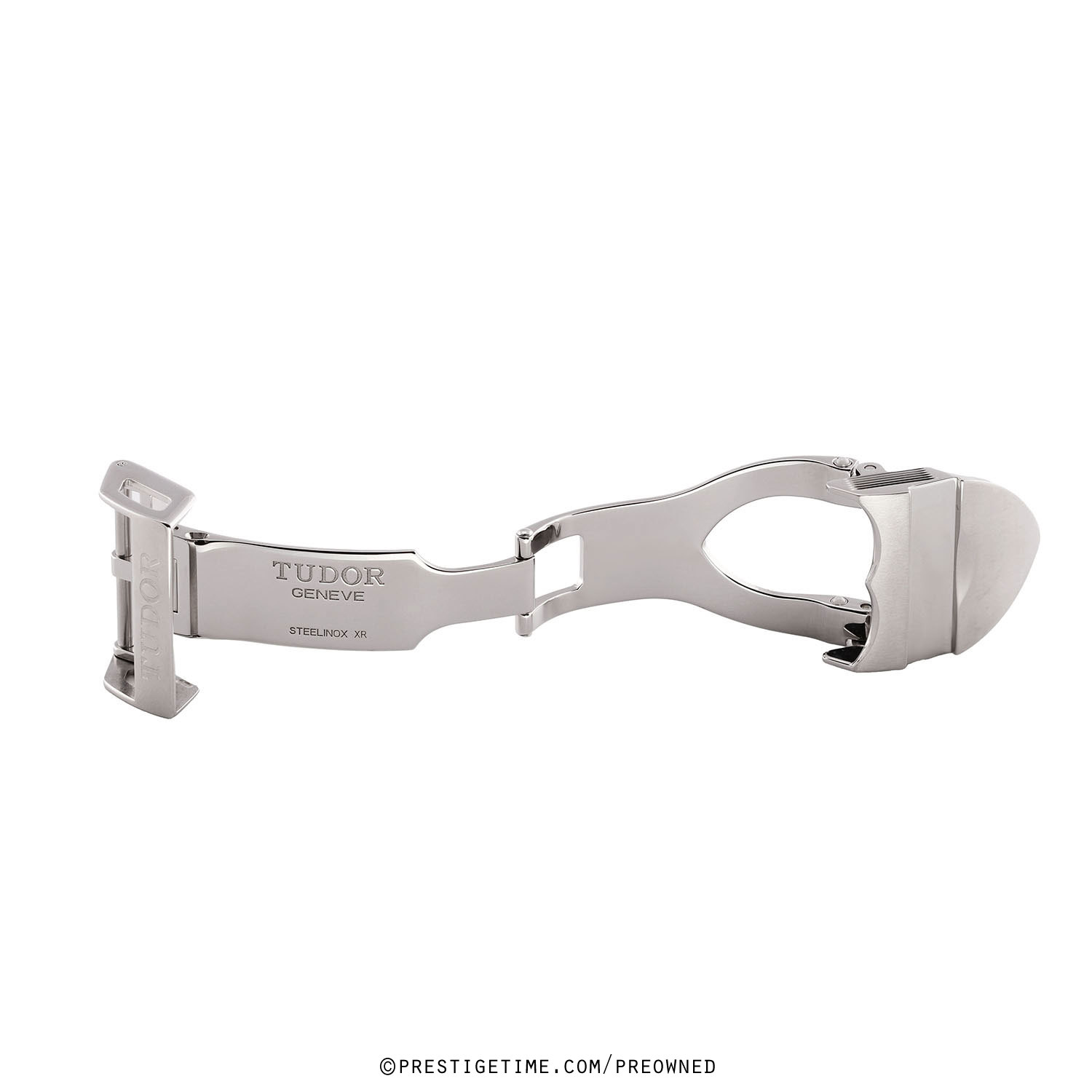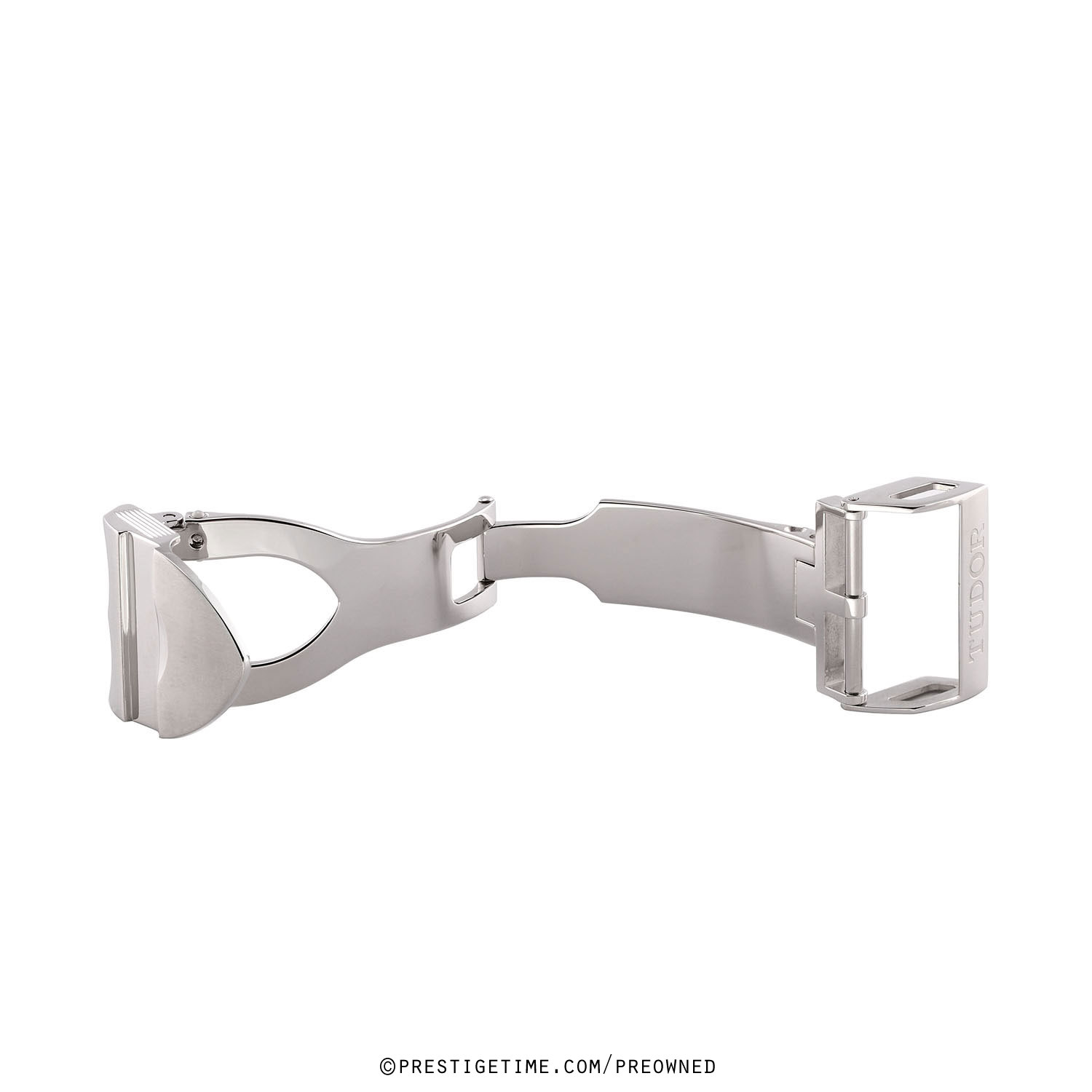 Genuine Tudor, stainless steel deployant buckle with fold over safety clasp. To fit a 18mm strap. In unworn condition. Tudor name stamped on front of buckle.