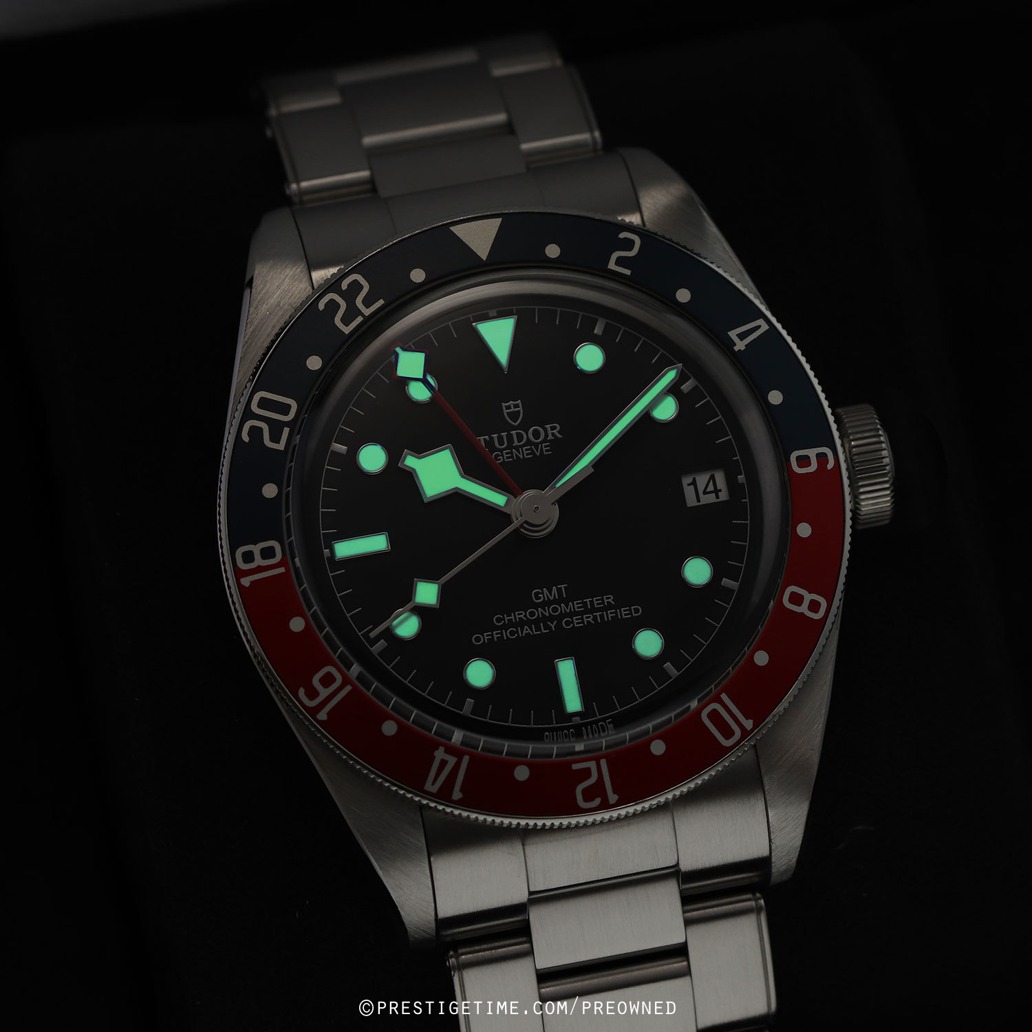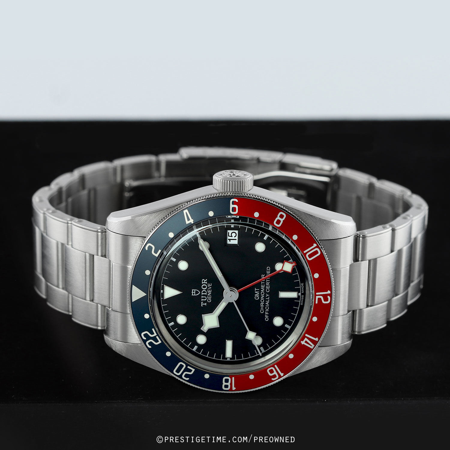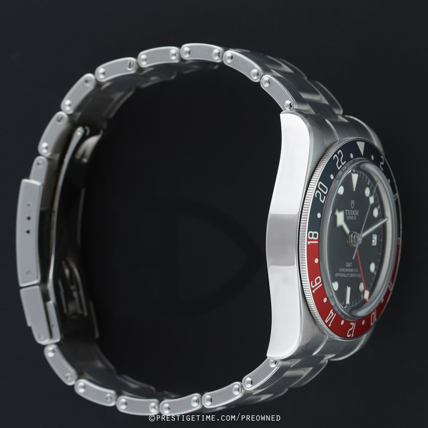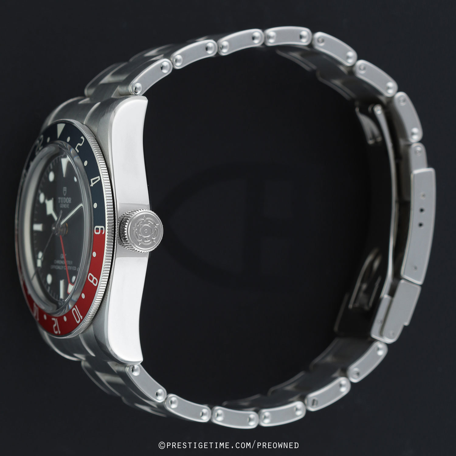 Case: Brushed & polished stainless steel case. Blue & red 'PEPSI' aluminum bezel ring with 24 hour indications. Crown with the TUDOR rose engraved. Matte black dial. Polished angular 'snowflake' hands with luminous fill. Applied polished hour markers with luminous fill. Fine printed minute/seconds track.