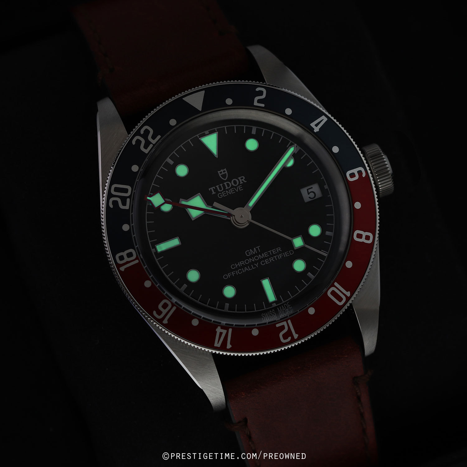 Case: Brushed & polished stainless steel case. Blue & red 'PEPSI' aluminum bezel ring with 24 hour indications. Crown with the TUDOR rose engraved. Matte black dial. Polished angular 'snowflake' hands with luminous fill. Applied polished hour markers with luminous fill. Fine printed minute/seconds track.