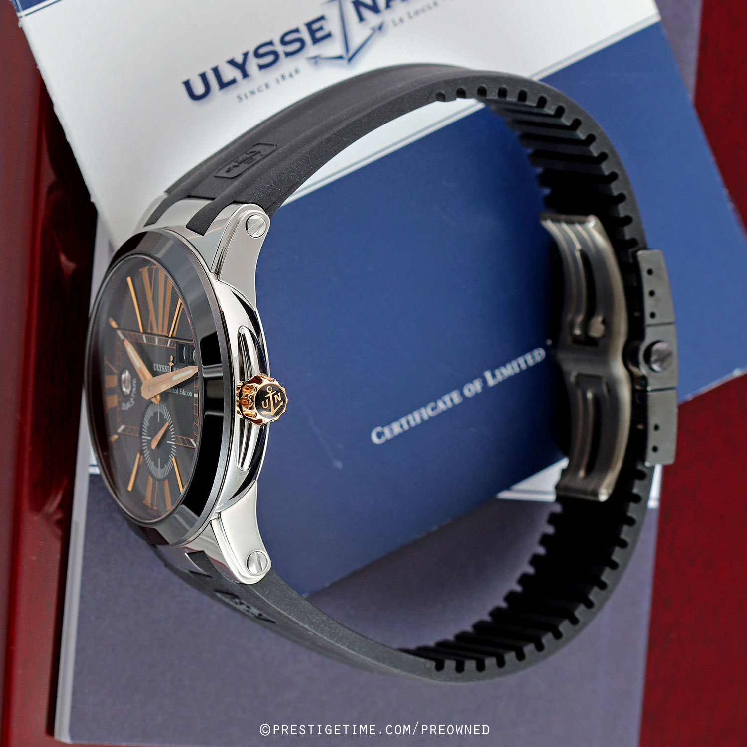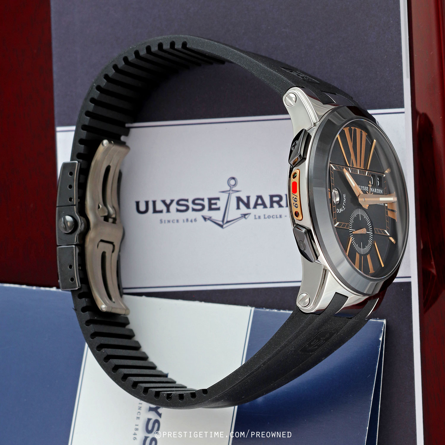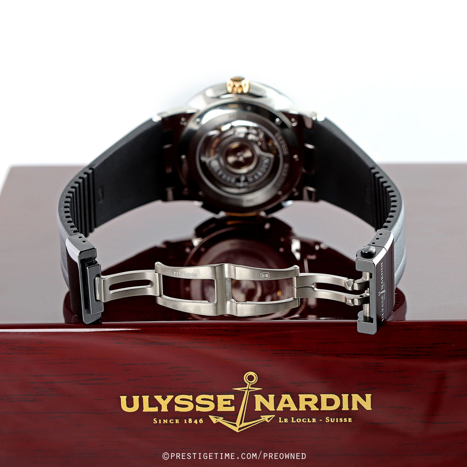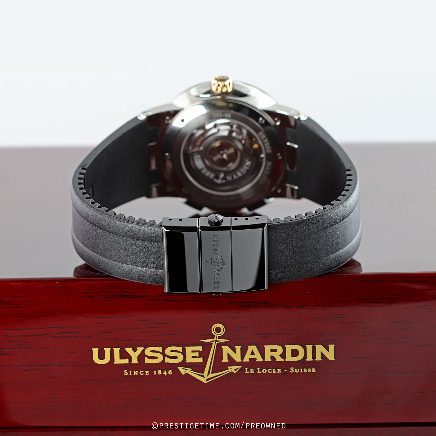 Strap: Fitted on its original Ulysse Nardin black rubber strap with a push-button black ceramic & titanium deployant buckle. The strap is at full length & will fit up to a 9" wrist. The strap will in all likelihood need to be cut down to size.