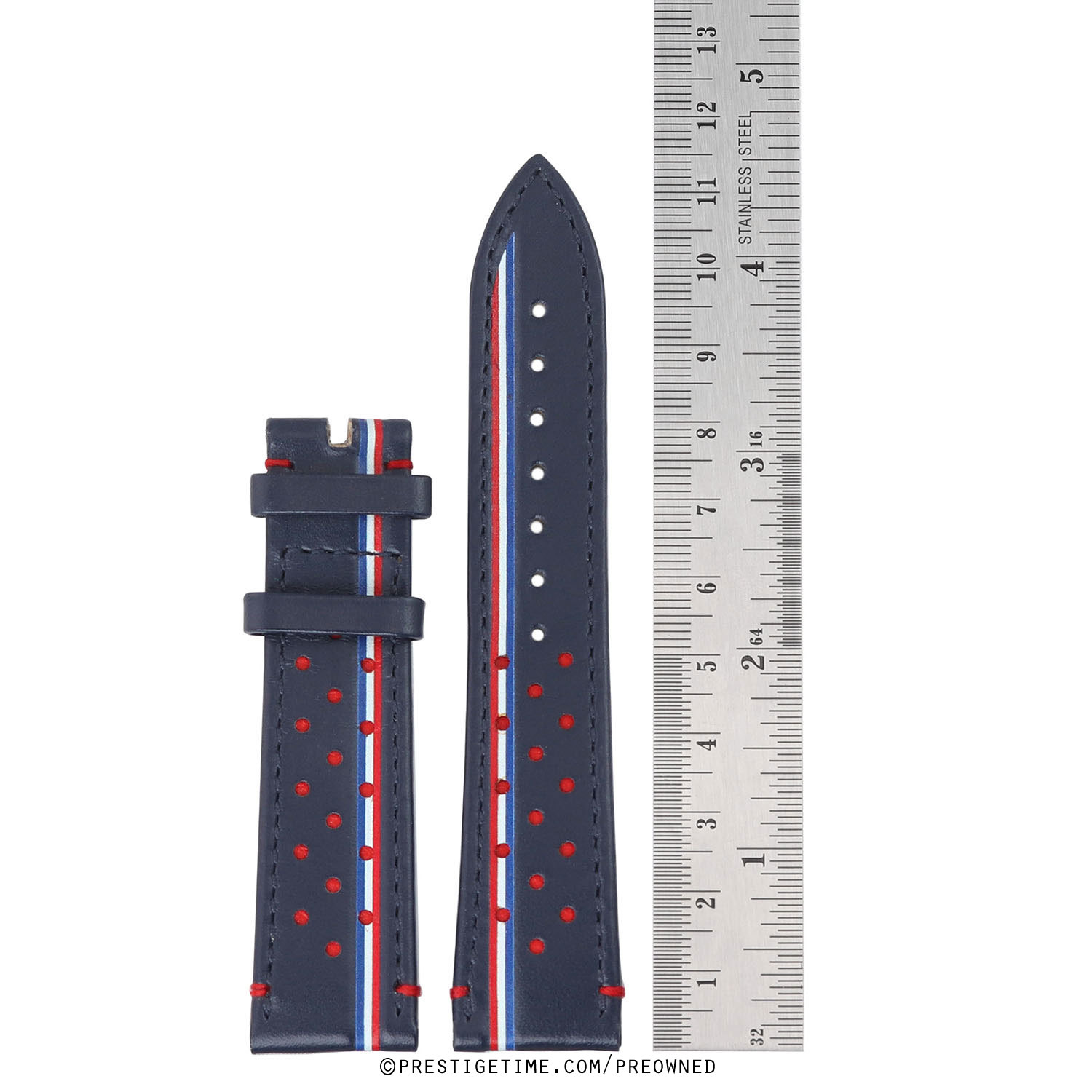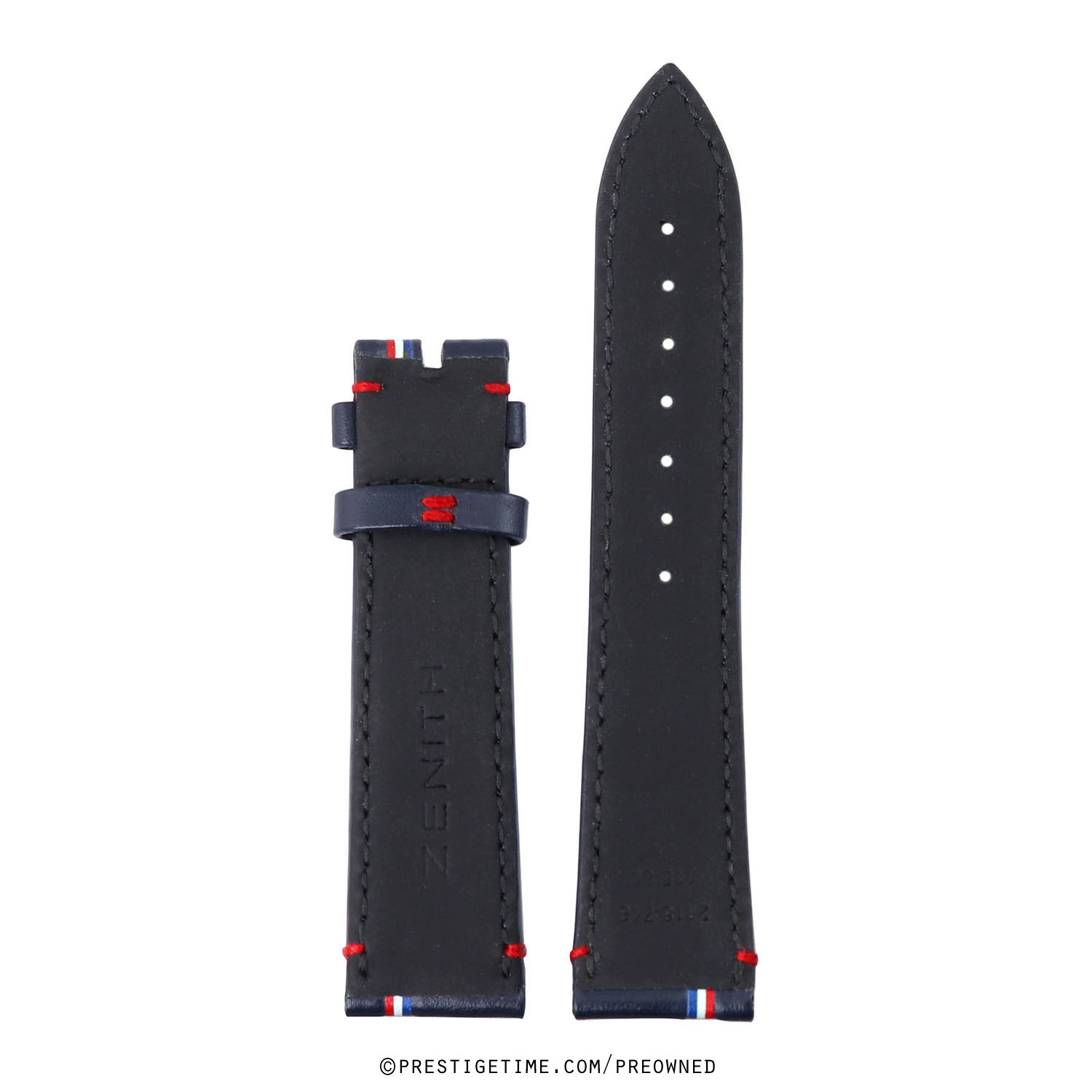 Genuine Zenith blue calfskin perforated strap with red/white/blue stripes.