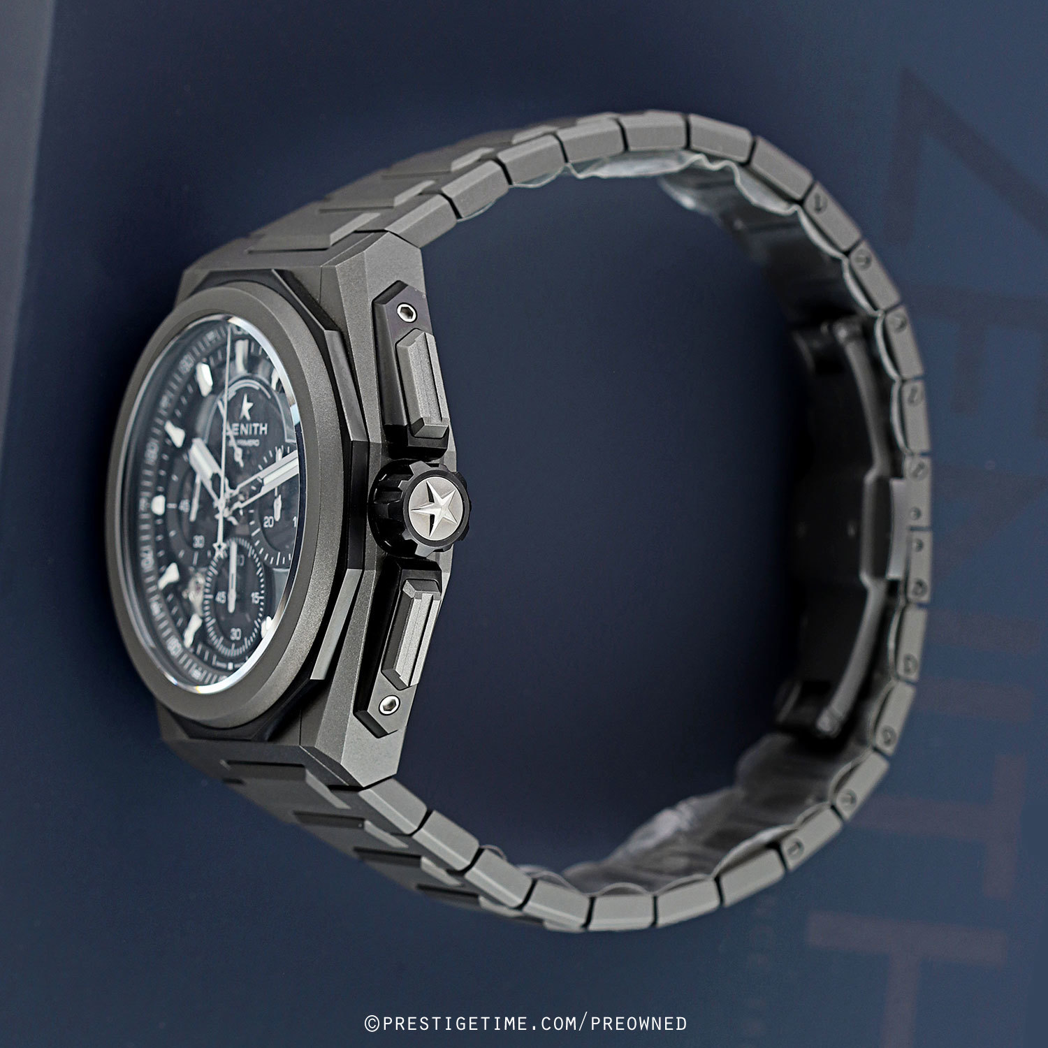 Case: Microblasted titanium case giving the case are darkened grey look. Black titanium lower bezel & chrono button guards. Tinted sapphire crystal dial with black sub-dial rings. Black dial flange with a 1/100th of a second scale. Bold hands, the hour & minute hands with luminous fill. Applied index hour markers with luminous fill. Printed minutes track. Small seconds sub-dial at 9 o'clock.